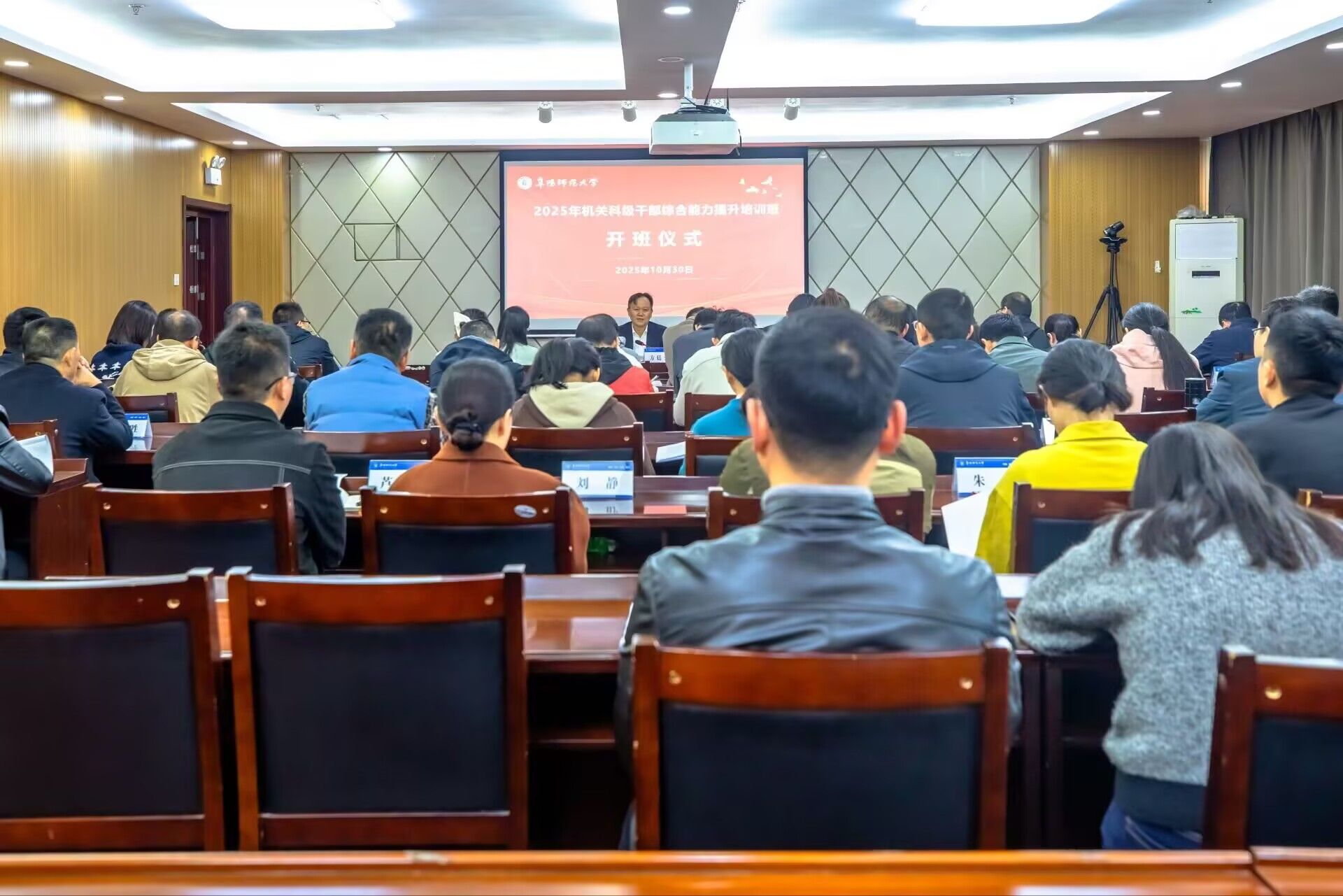 为深入学习贯彻党的二十届四中全会精神,全面落实新时代党的建设总要求与干部教育培训规划,聚焦机关科级干部政治理论水平、业务履职能力与管理服务效能的全方位提升,10月30日上午,学校机关科级干部综合能力提升培训班举行开班仪式。校党委副书记、校长方廷勇出席并作开班动员讲话,开班仪式由校党委常委、副校长窦贤琨主持,培训班第一期全体机关科级干部参加开班仪式。