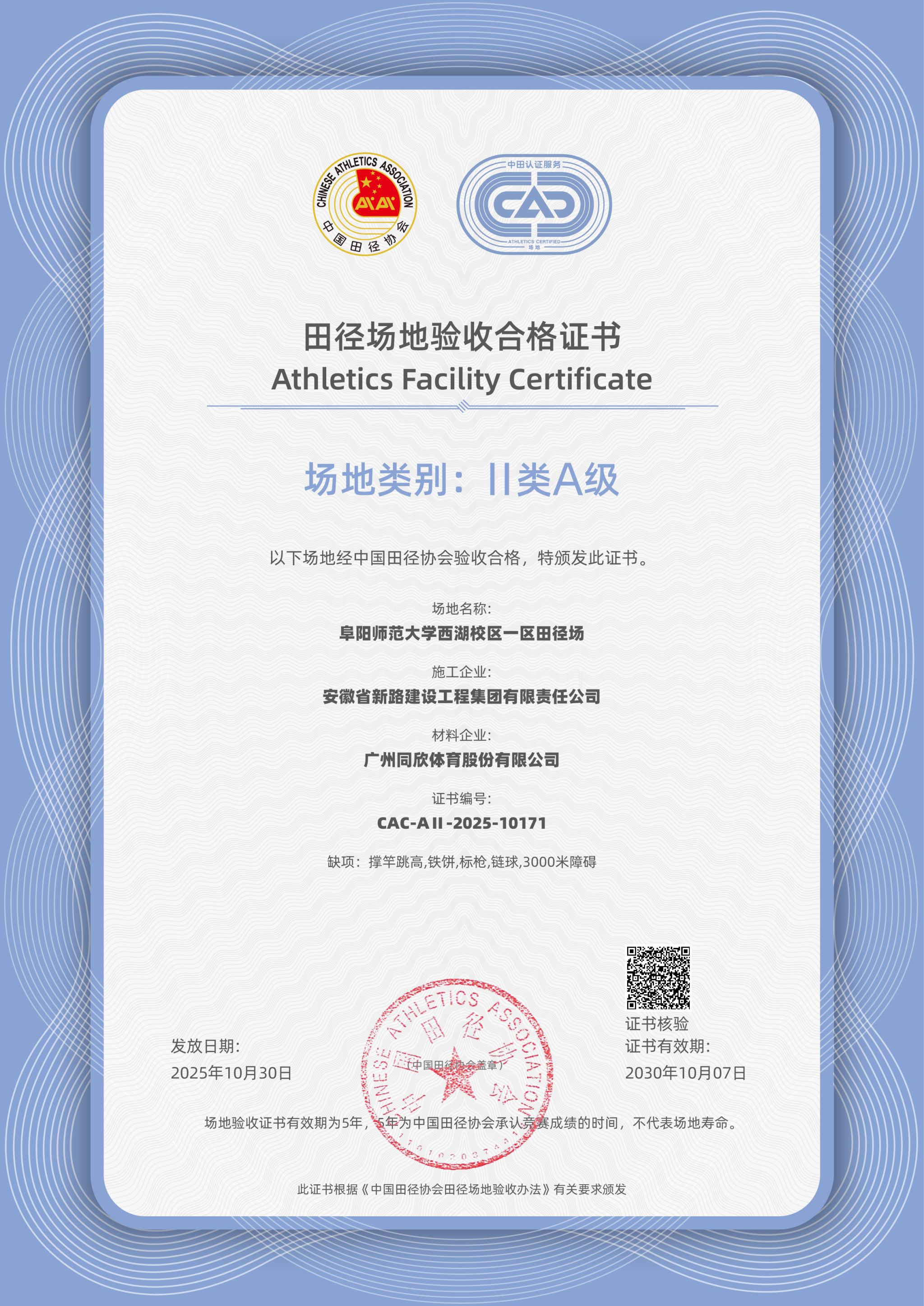 本次验收,中国田径协会专家组依据《中国田径协会田径场地验收办法》的相关验收标准,对赛道的外观、厚度、平整度、坡度、点线位以及有害物质含量、释放量等方面进行了全面的检测和评估,各项检测指标满足二类场地验收标准,通过场地验收。据悉,这是目前阜阳市和皖北片区高校唯一获得此项荣誉认证的田径场地。按照有关规定和标准,中国田径协会对于在二类场地上举办的全国性田径竞赛中创造的田径运动成绩,予以认可。