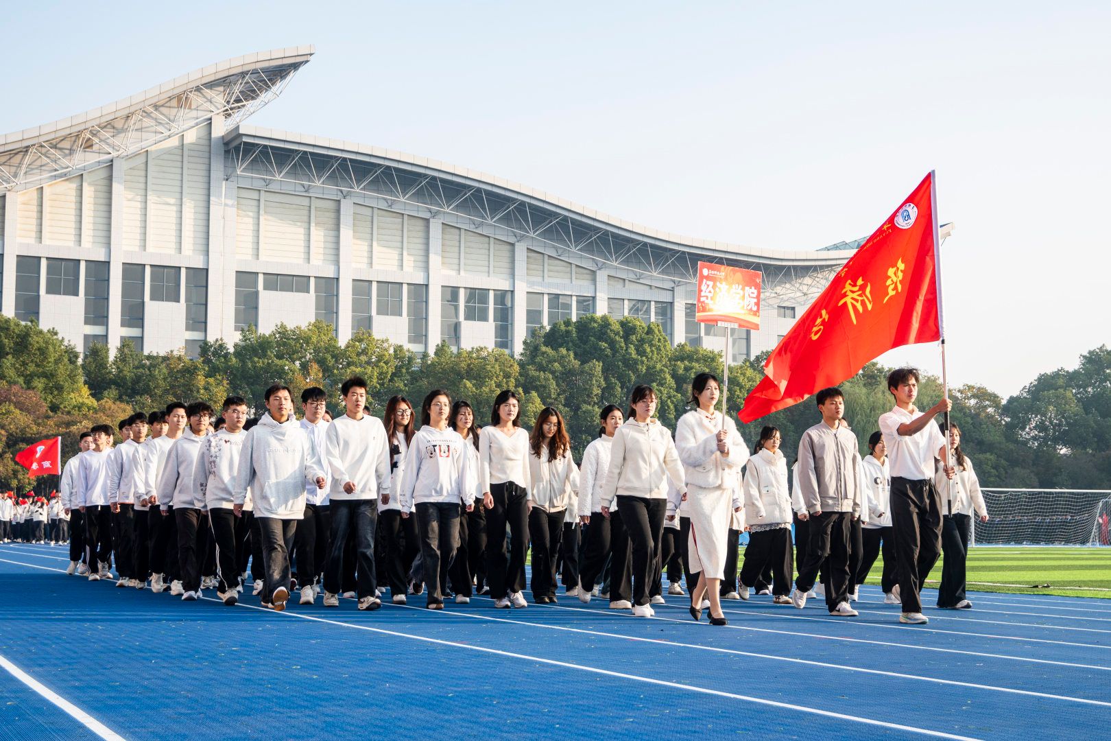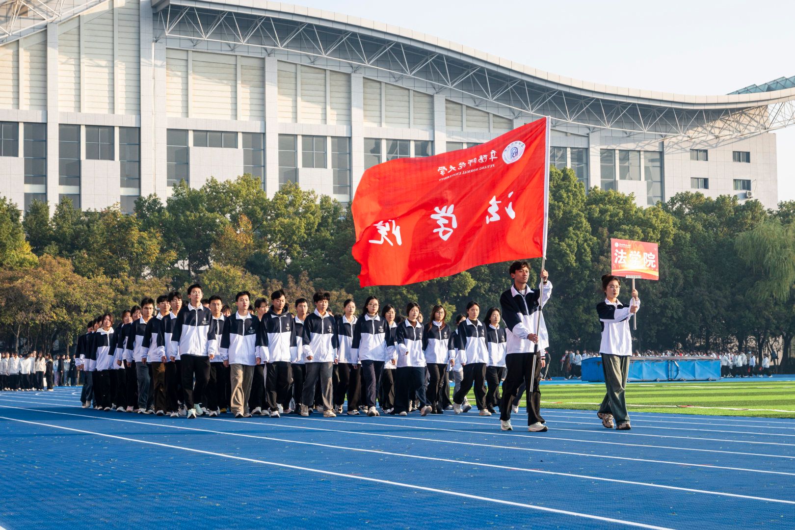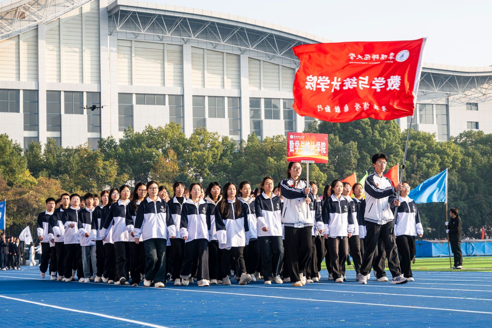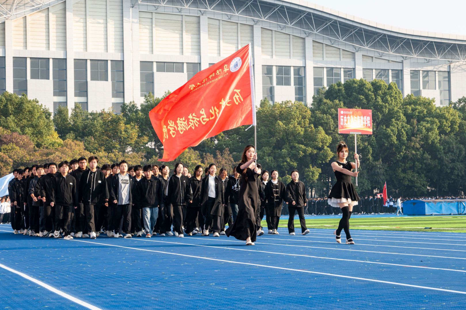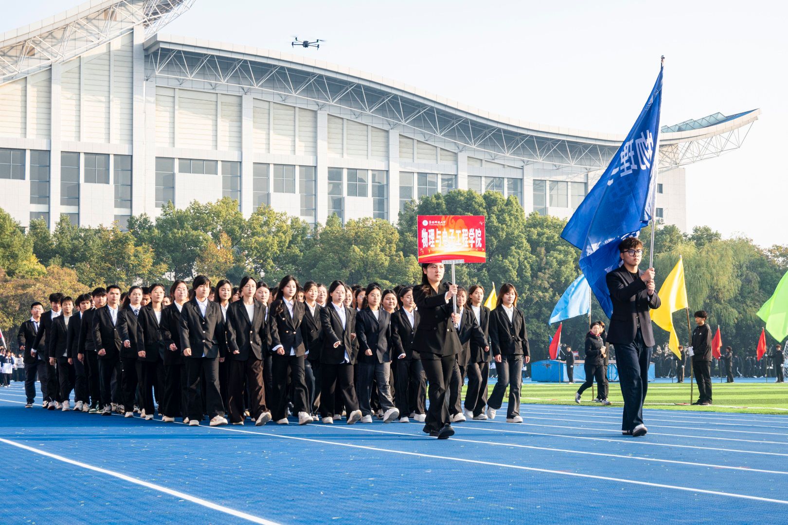 伴随着激昂的《运动员进行曲》,首先入场的是国旗方阵,五星红旗表现了中国共产党领导下的革命人民大团结;随后入场的是校旗队、会旗队、全体运动员及各学院方阵,旌旗招展,彩旗飘扬,各学院方队彰显学院特色,精彩纷呈。
