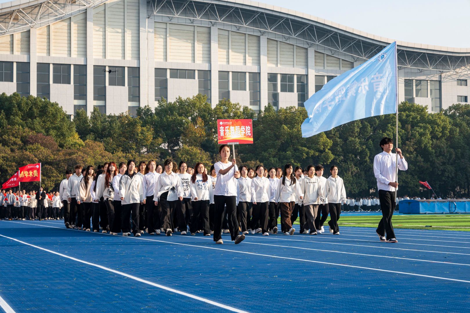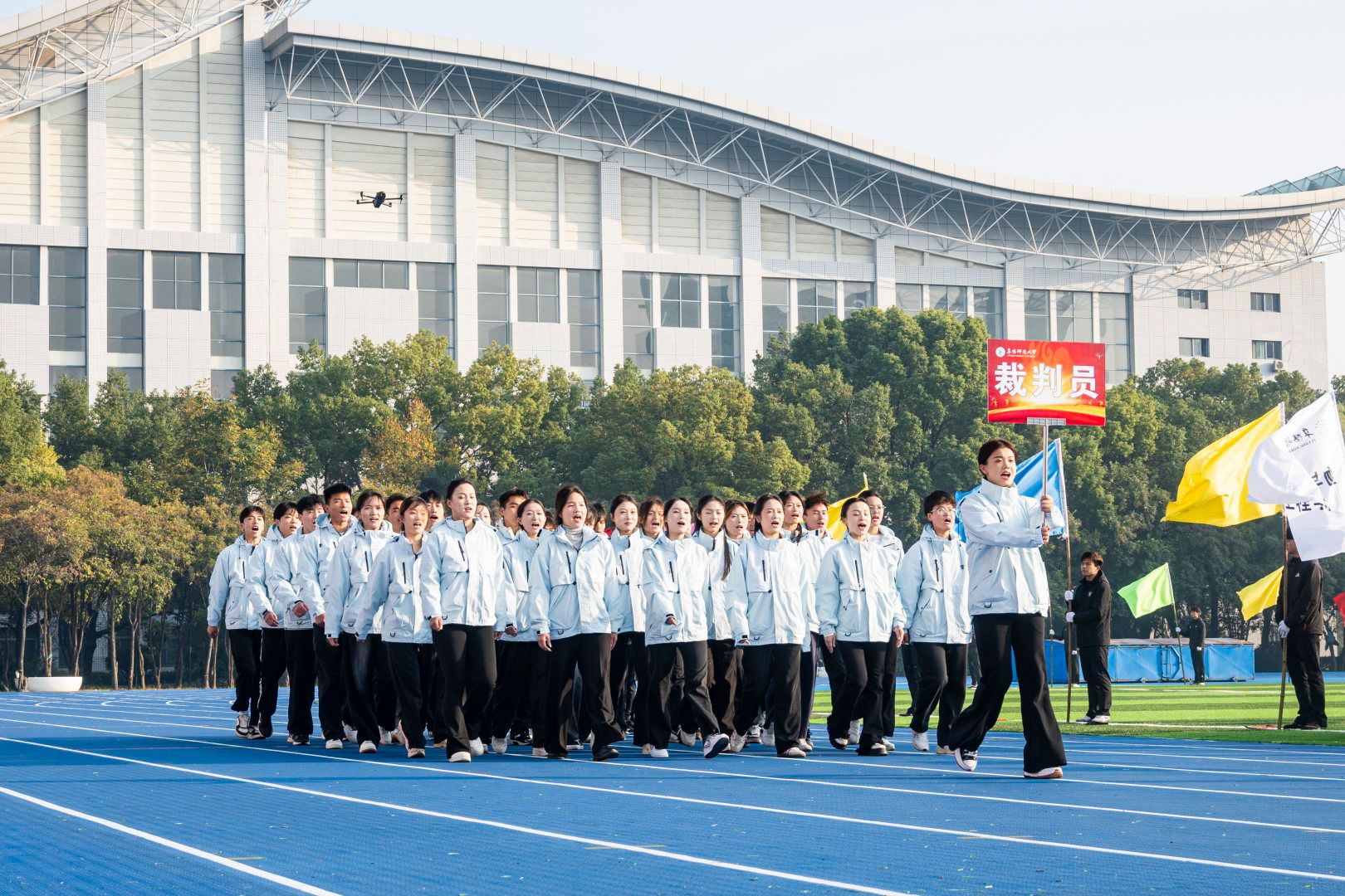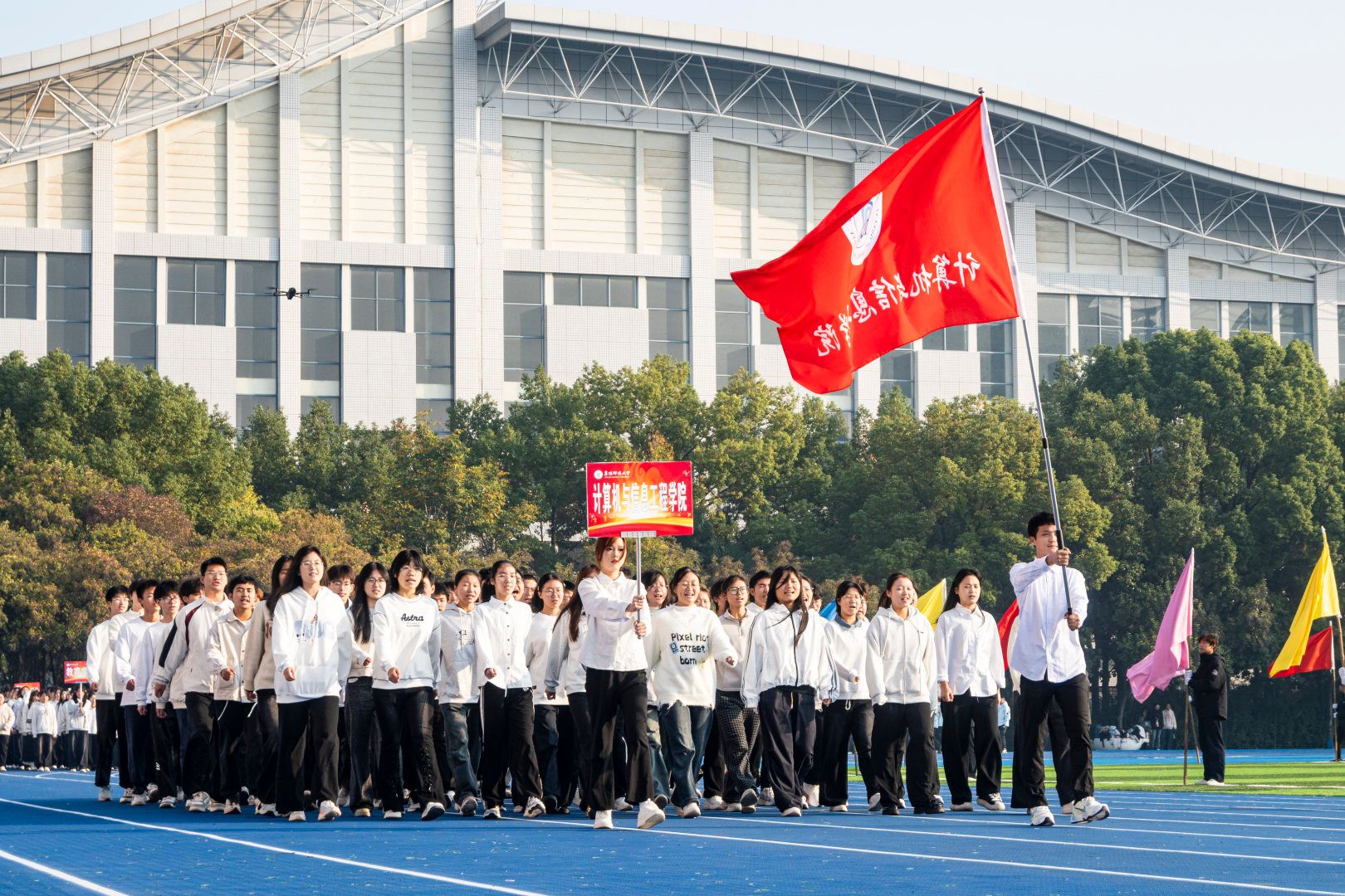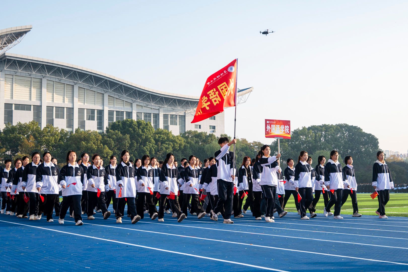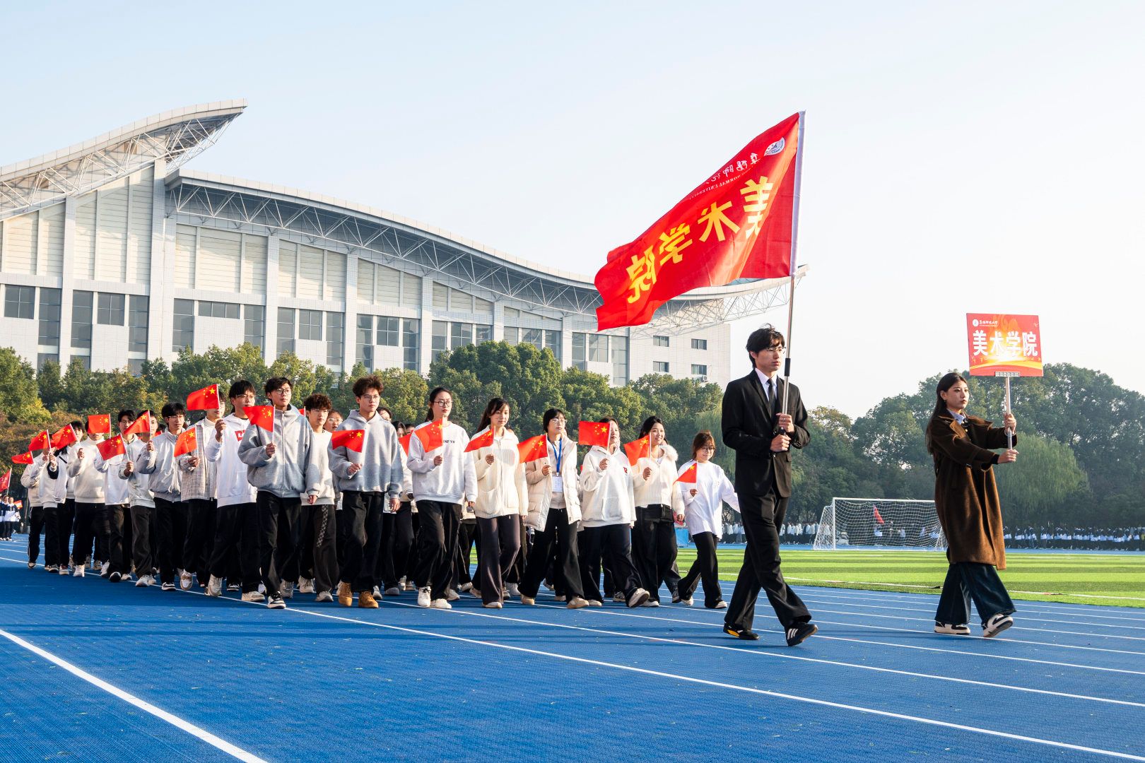 伴随着激昂的《运动员进行曲》,首先入场的是国旗方阵,五星红旗表现了中国共产党领导下的革命人民大团结;随后入场的是校旗队、会旗队、全体运动员及各学院方阵,旌旗招展,彩旗飘扬,各学院方队彰显学院特色,精彩纷呈。