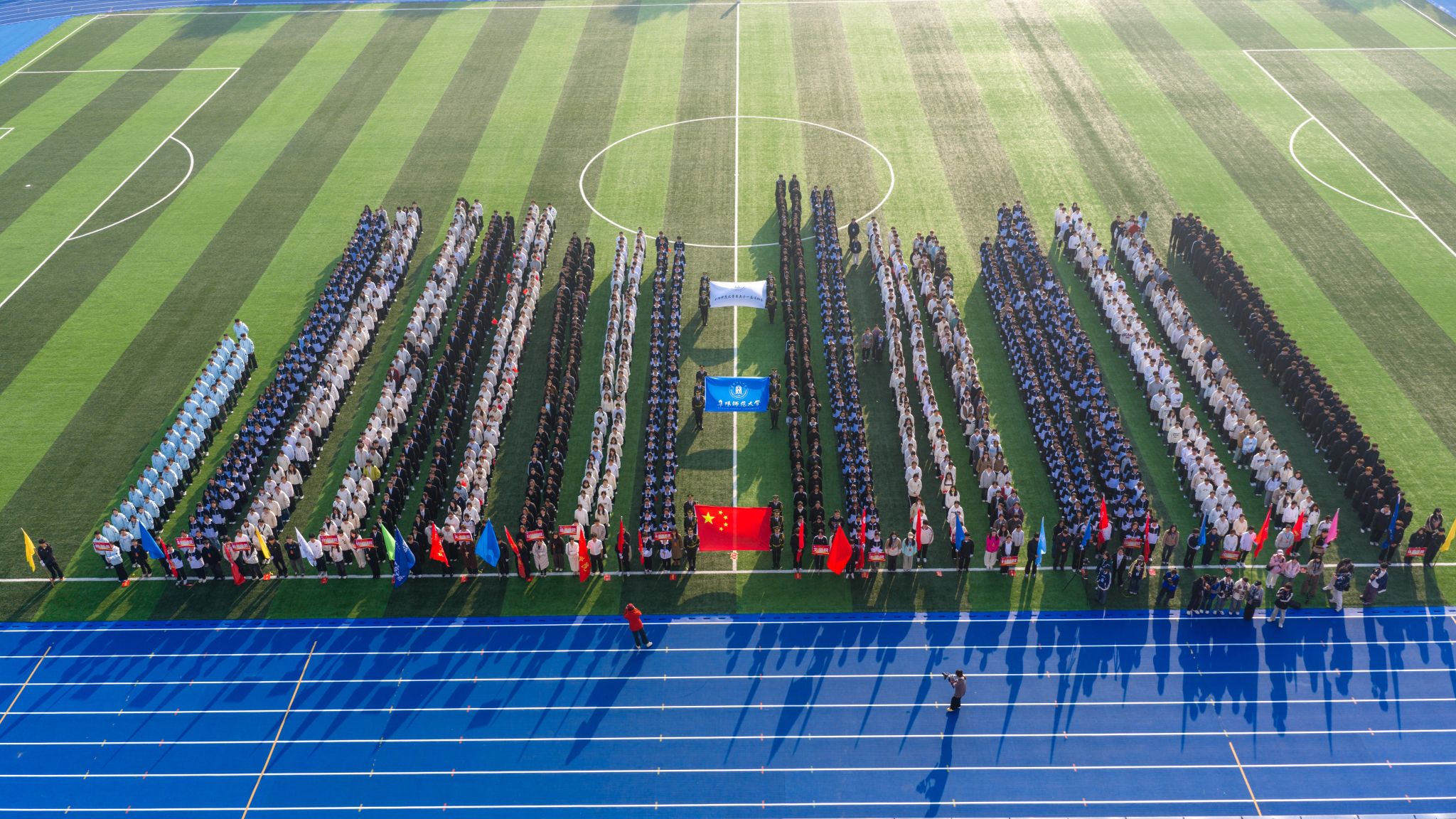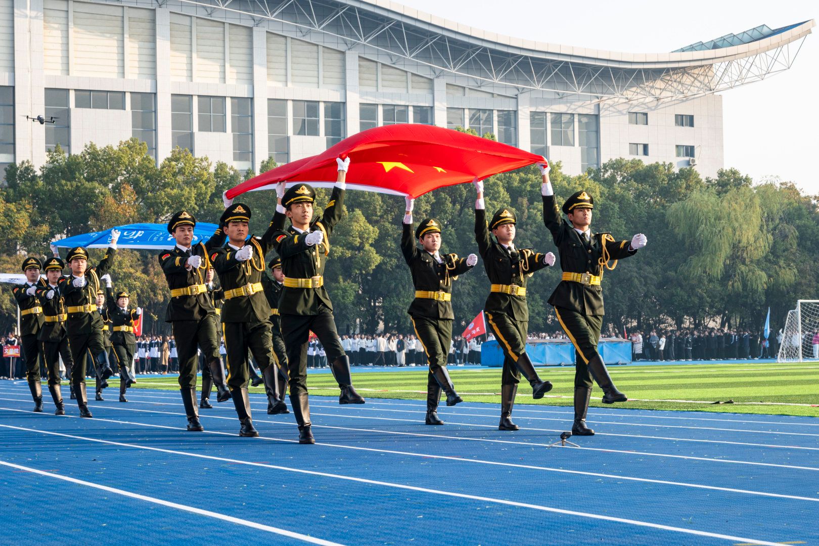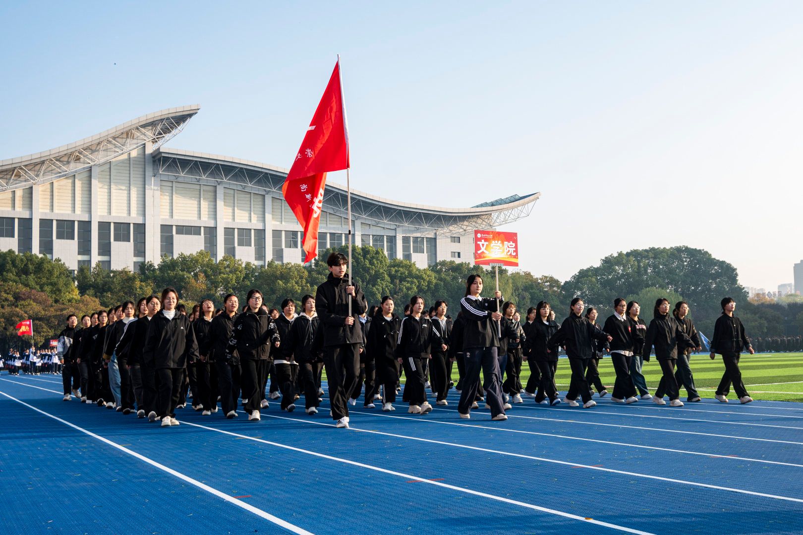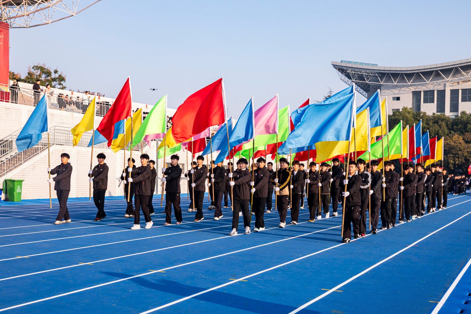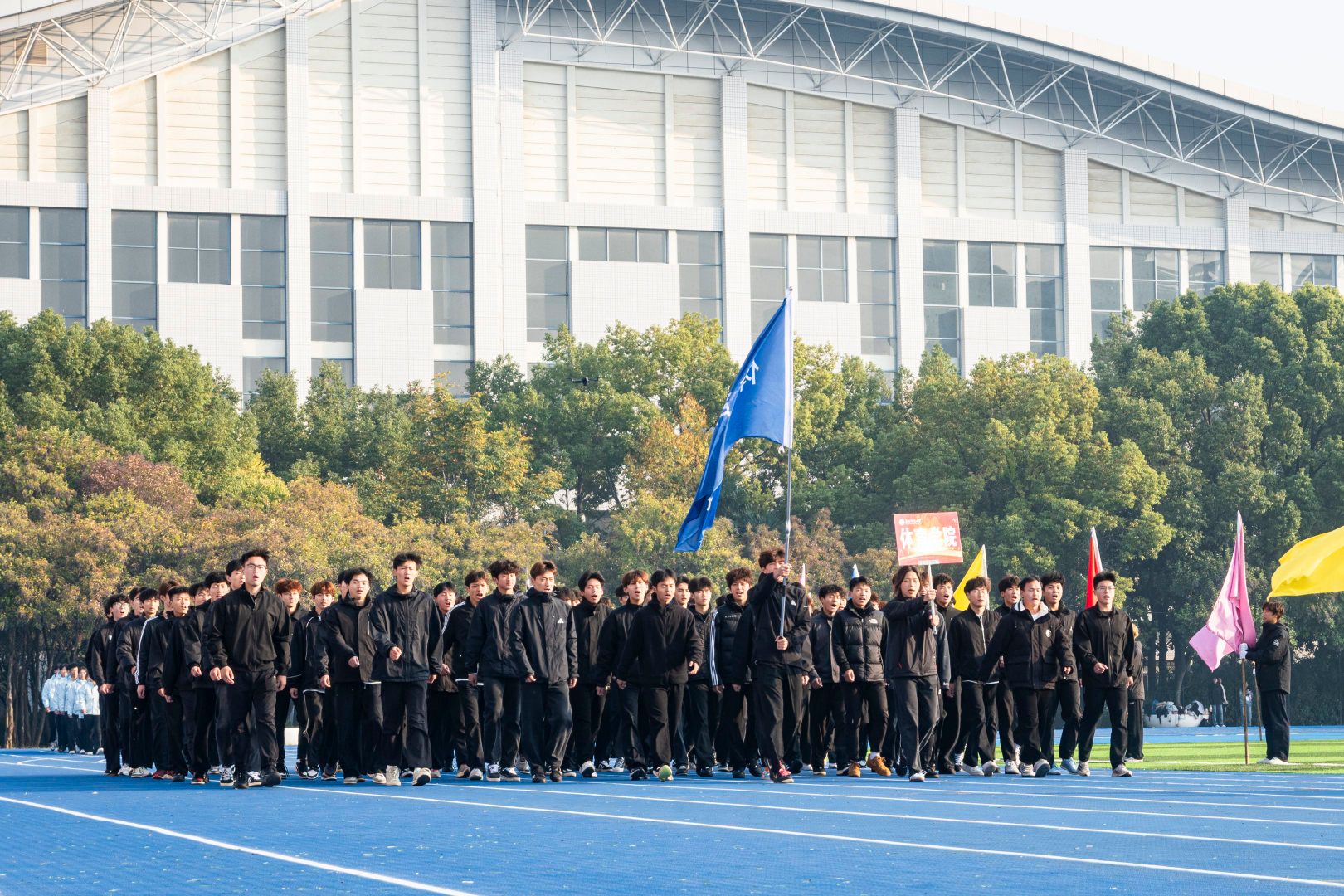 伴随着激昂的《运动员进行曲》,首先入场的是国旗方阵,五星红旗表现了中国共产党领导下的革命人民大团结;随后入场的是校旗队、会旗队、全体运动员及各学院方阵,旌旗招展,彩旗飘扬,各学院方队彰显学院特色,精彩纷呈。