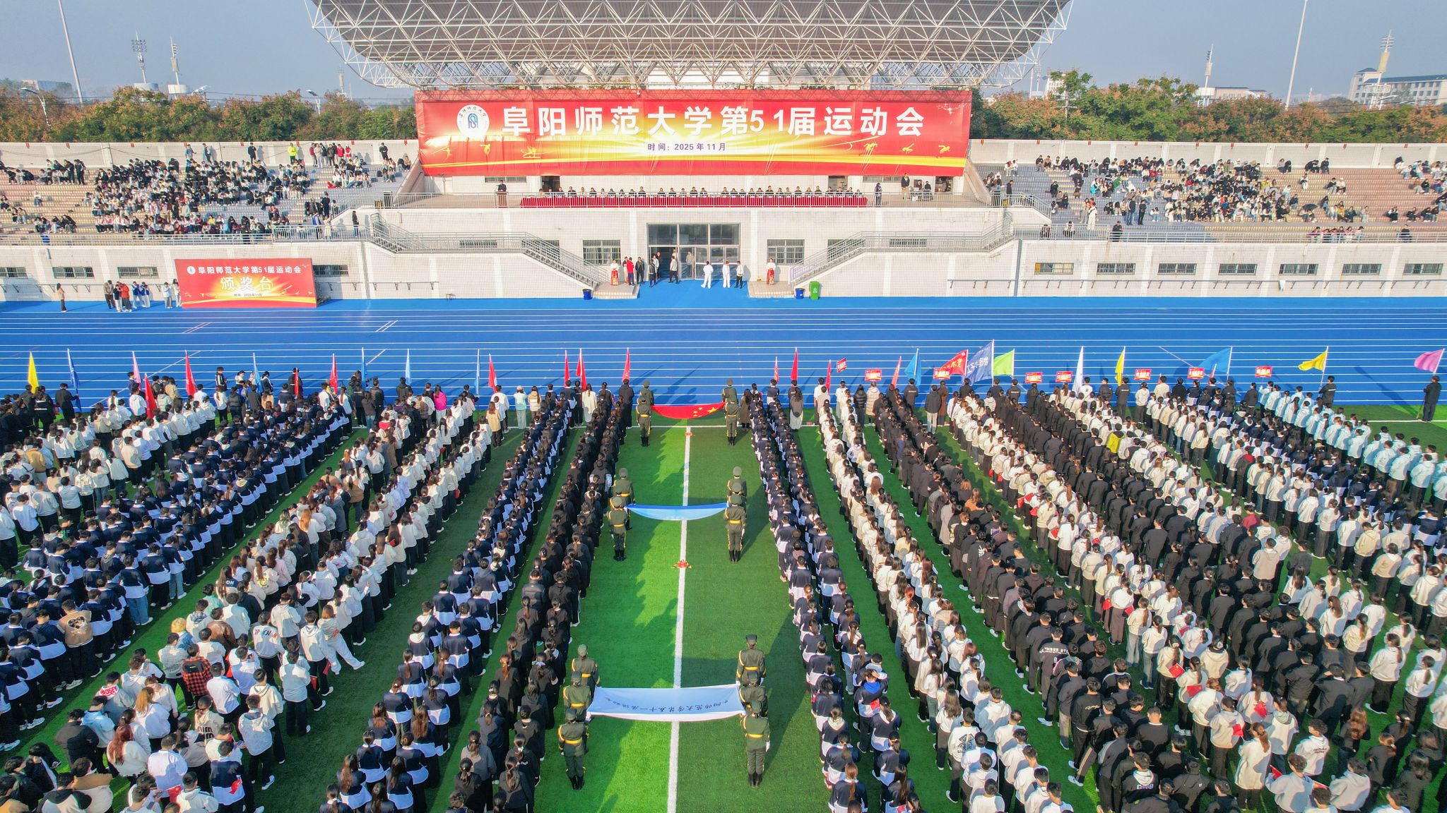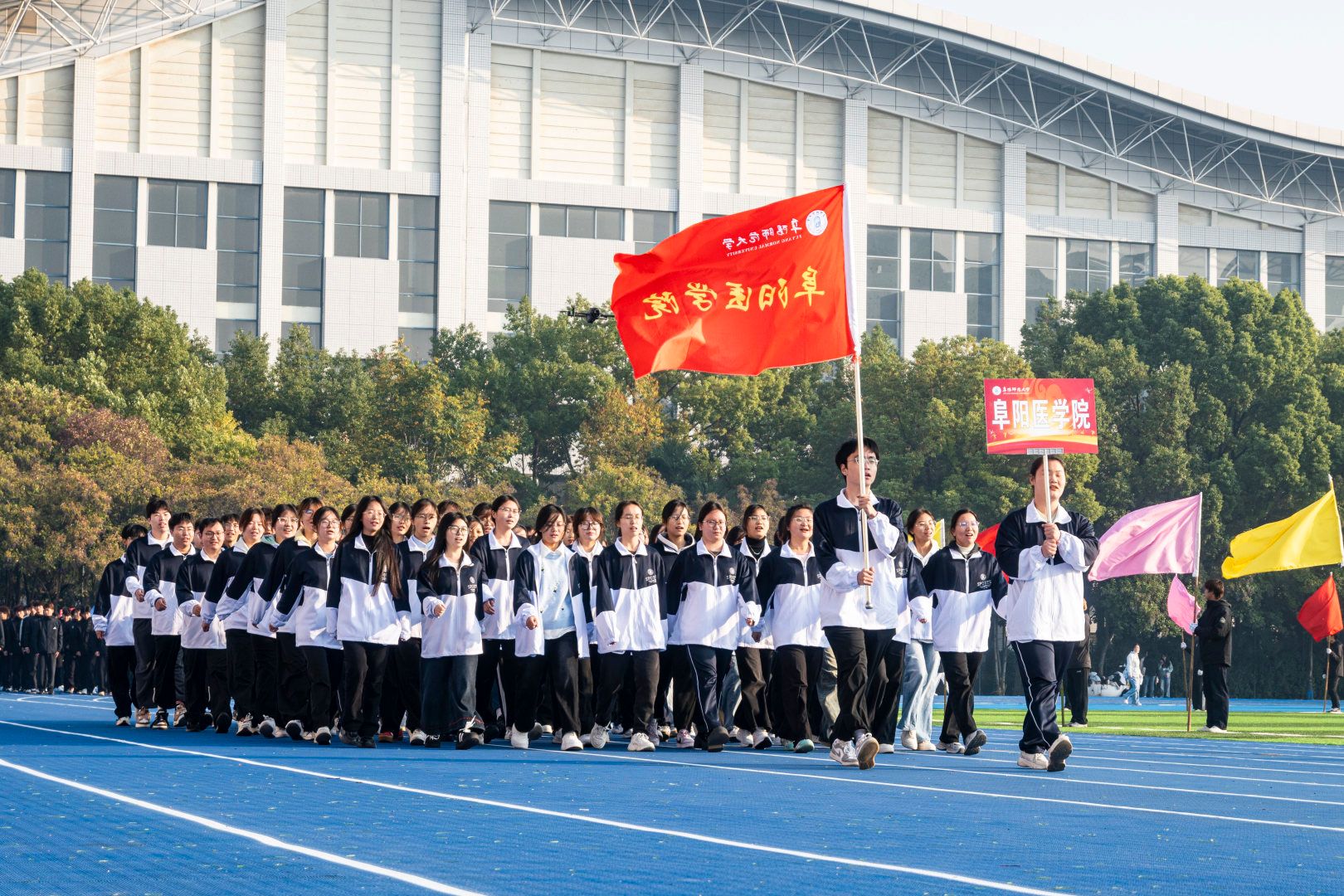 秋高气爽,硕果累累,为积极响应建设体育强国的号召,进一步锻炼培养全校师生的意志品质,展现精神面貌,11月5日上午,我校在西湖校区西田径场举行阜阳师范大学第五十一届运动会开幕式。在校校领导方廷勇、季爱新、黄云志、窦贤琨、卢少求、王诗兵出席开幕式,各学院、相关部门主要负责人,校运会组委会全体人员、全体运动员、裁判员、领队和各学院师生代表参加开幕式。开幕式由校党委常委、纪委书记、监察专员季爱新主持。