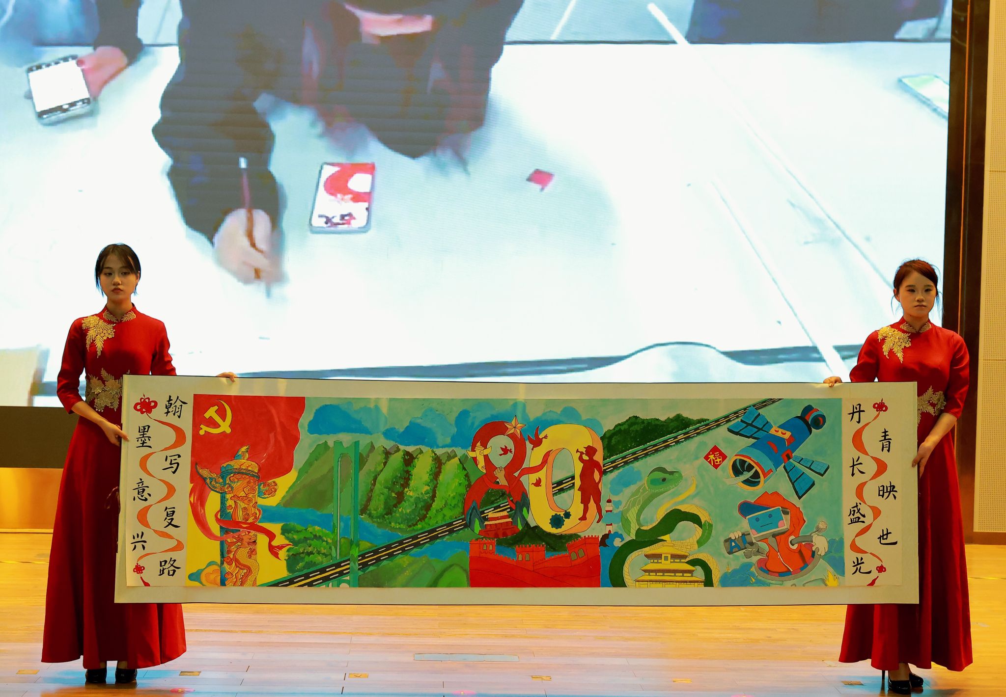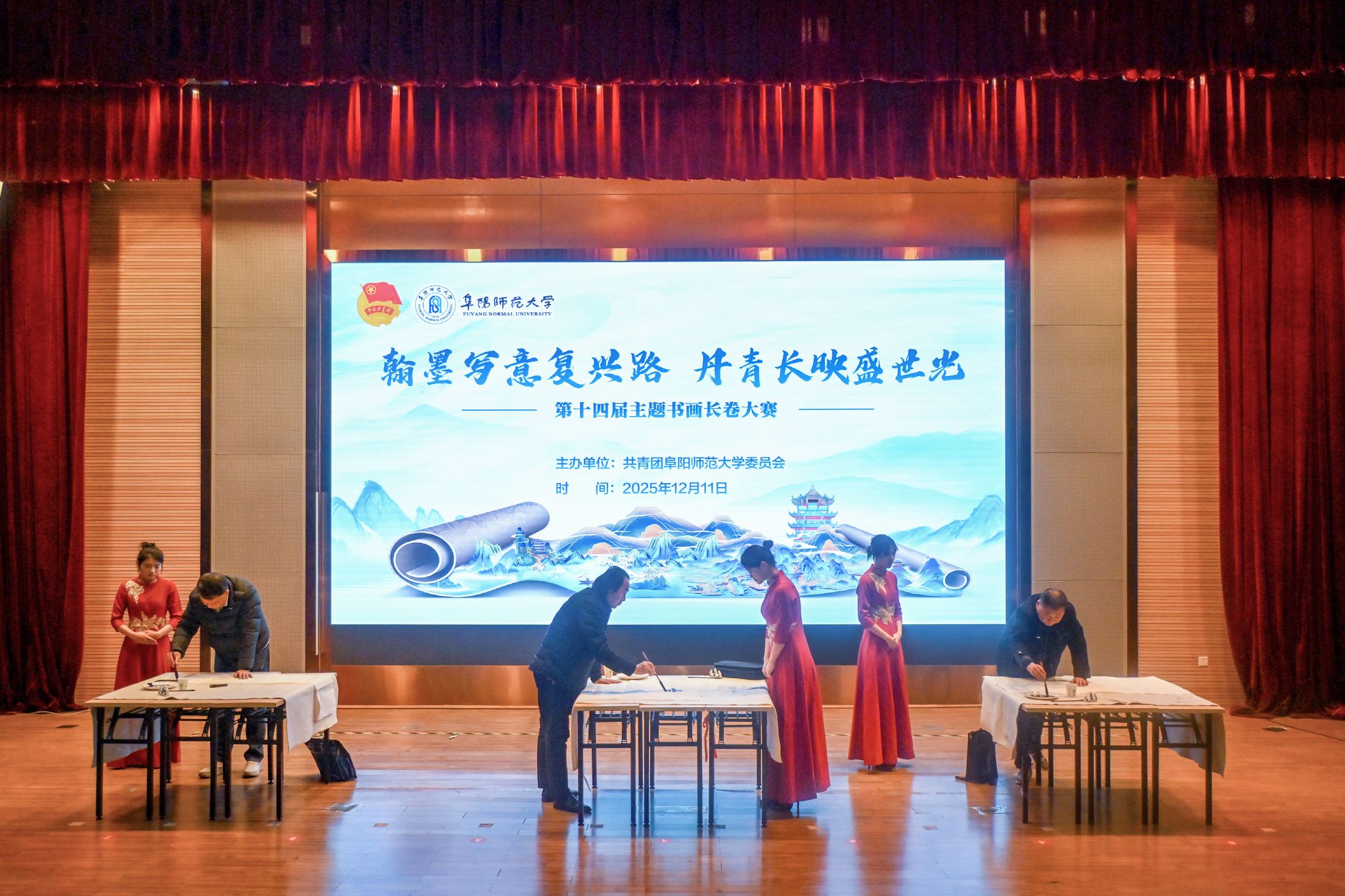 为深入学习贯彻党的二十届四中全会精神,传承中华优秀传统文化,厚植师生家国情怀,12月11日下午,我校在西湖校区正行楼二楼报告厅举办“翰墨写意复兴路 丹青长映盛世光”第十四届主题书画长卷大赛。安徽省高校书法协会阜阳工作站站长姚庆良、安徽省书法协会会员秦予人、江苏省国画院特聘画家李秋风应邀担任本次大赛评委。党委宣传部(党委统战部)、学生工作处、安全管理处、校团委等单位有关负责人、各学院师生代表近400人观看比赛。