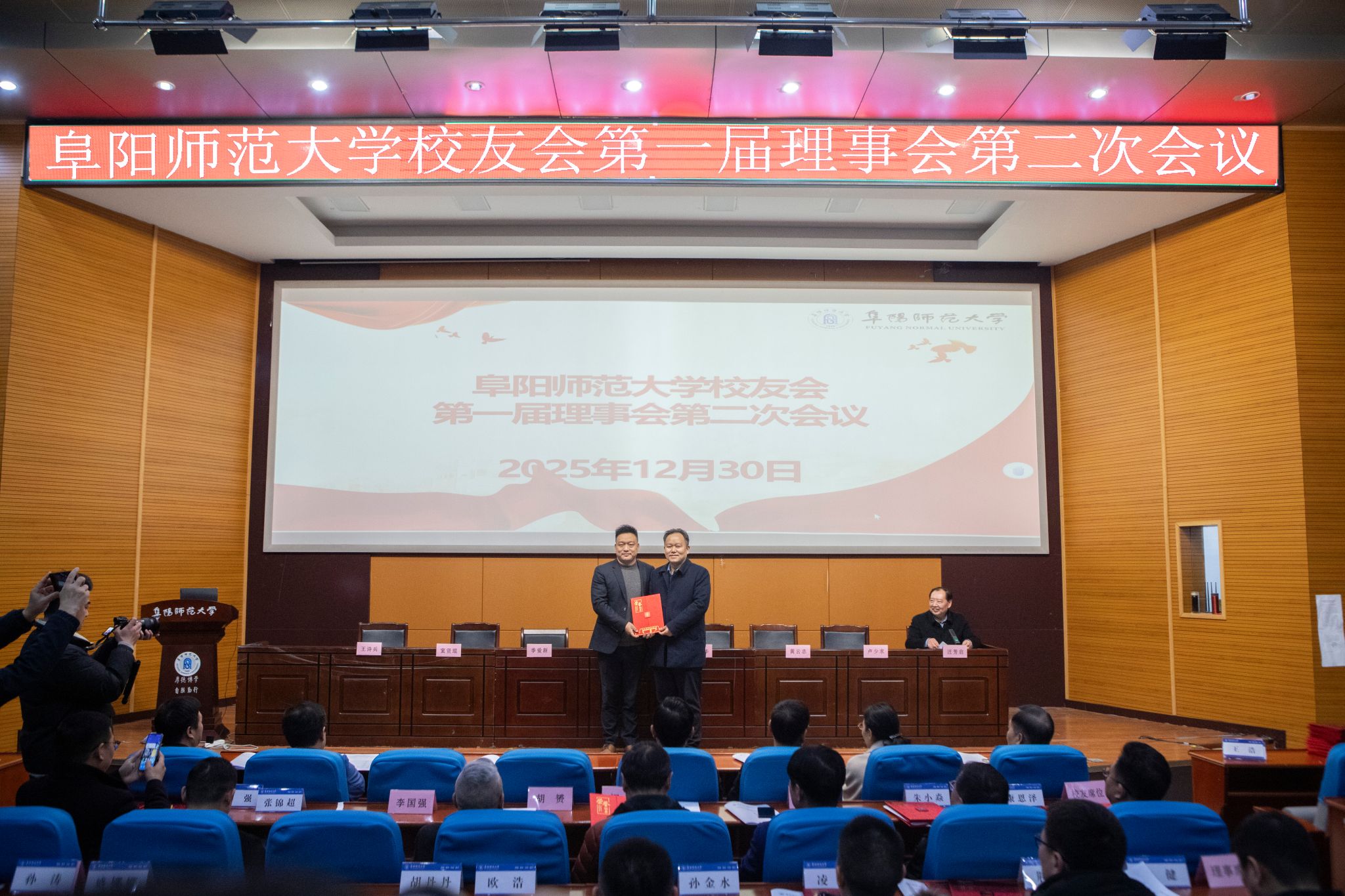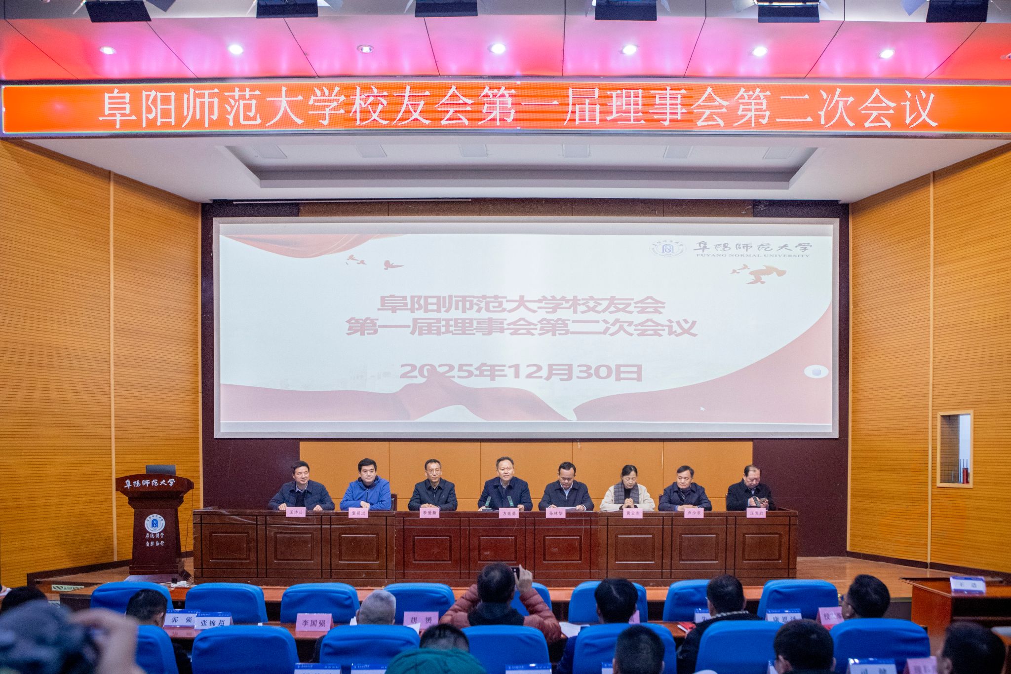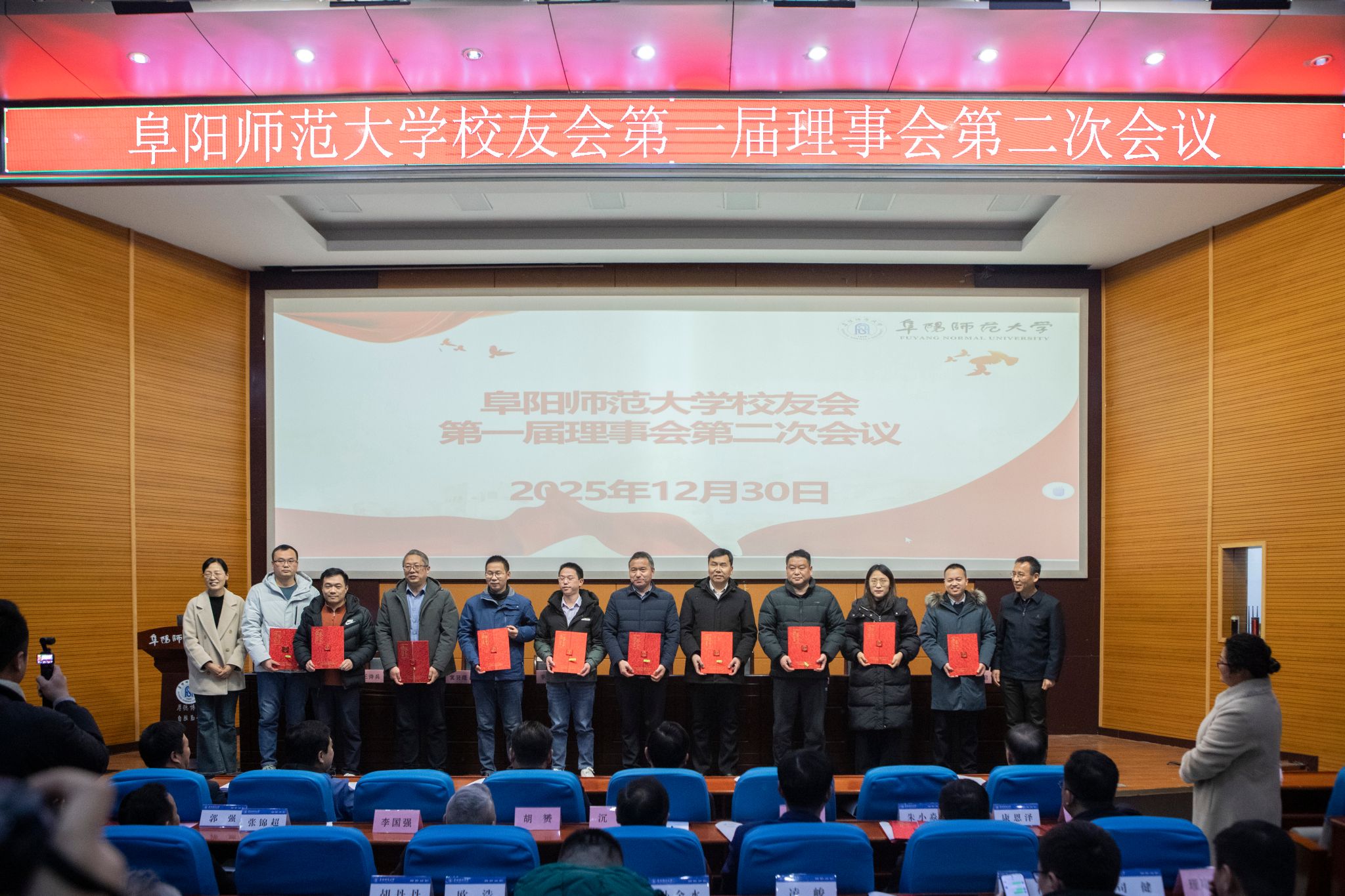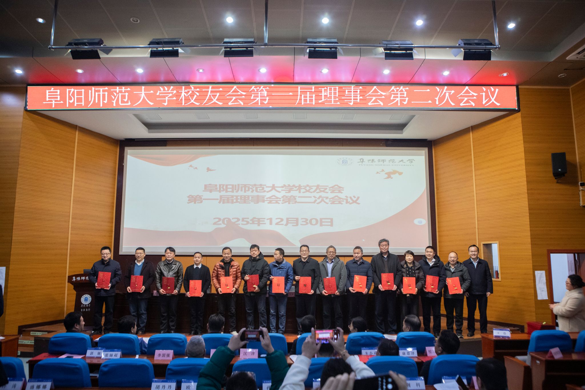 12月30日下午,阜阳师范大学校友会第一届理事会第二次会议在F楼报告厅召开。校党委副书记、校长、校友会副会长方廷勇出席会议并讲话,在校校领导孙林华、季爱新、黄云志、窦贤琨、卢少求、王诗兵出席会议并颁奖,各地校友及地方校友会代表和相关学院代表与校友会第一届理事会理事、监事、副秘书长等参加会议,会议由校友会副会长汪芳启主持。