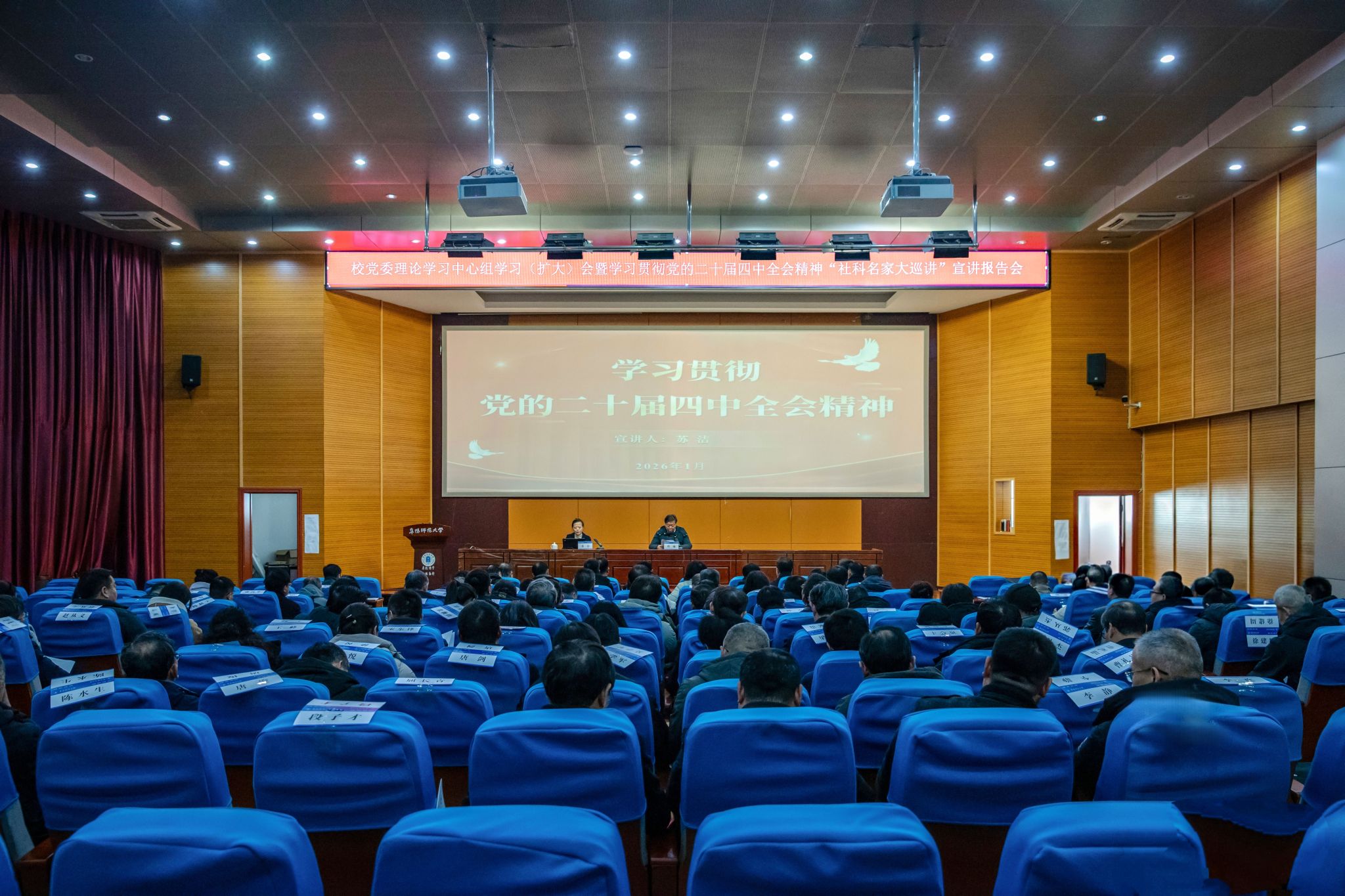 1月14日上午,2026年度校党委理论学习中心组学习(扩大)会暨学习贯彻党的二十届四中全会精神“社科名家大巡讲”宣讲报告会在西湖校区F楼报告厅举行。学习贯彻党的二十届四中全会精神“社科名家大巡讲”宣讲团成员、安徽农业大学马克思主义学院院长苏洁教授应邀来校开展专题宣讲。在校校领导程曦、孙林华、窦贤琨、卢少求、王诗兵出席会议,校党委理论学习中心组成员、全校处级干部参加会议。会议由校党委书记程曦主持。