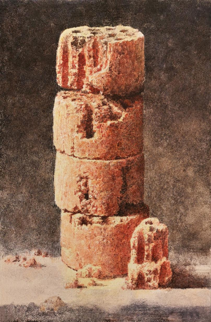 庞宗超的作品《印记·人间烟火》以水彩语言完成了一次对日常之物的诗意提纯。画面构图凝练,将燃烧后的时间痕迹转化为可触摸的视觉记忆。作品超越了物象本身的朴素,在方寸之间构建起深沉而温厚的集体记忆现场,体现了“以小见大”的美学追求与人文观照。