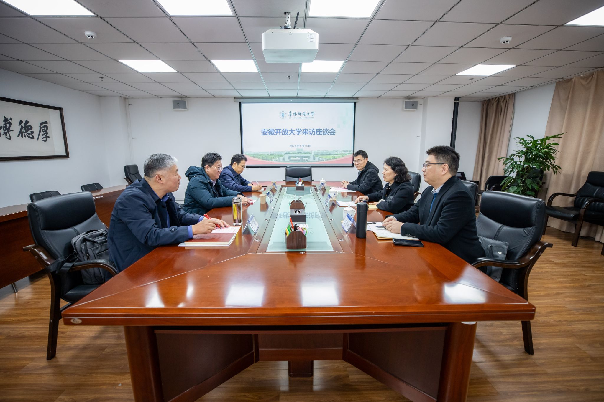 1月16日,安徽开放大学党委书记、校长杜爱玉一行来校调研交流。校党委书记程曦及相关单位负责人接待了来宾,双方在西湖校区正行楼1204会议室召开座谈会,就继续教育领域深化合作事宜进行研讨交流。