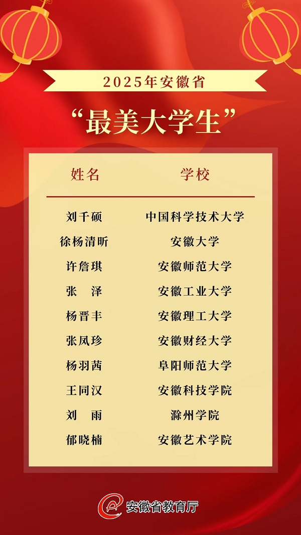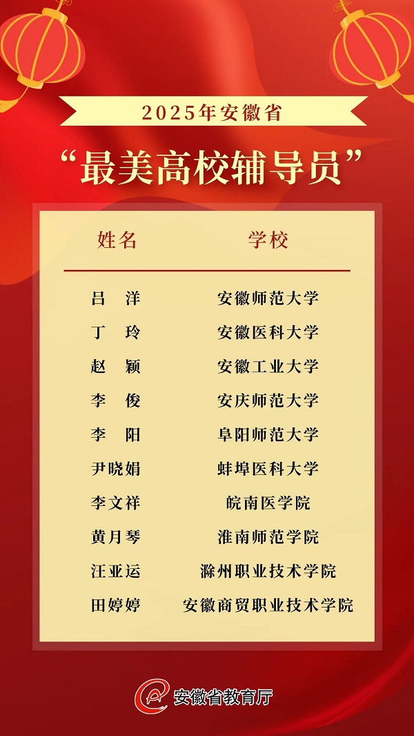 近日,中共安徽省委宣传部、省委教育工委联合组织开展2025年安徽省“最美高校辅导员”和“最美大学生”评选活动,经学校申报、专家评审、评委会评议等环节,评选产生了2025年安徽省“最美高校辅导员”和“最美大学生”各10名。我校美术学院专职辅导员李阳获安徽省“最美高校辅导员”荣誉称号,我校外国语学院2022级本科生、退役军人杨羽茜获安徽省“最美大学生”荣誉称号。