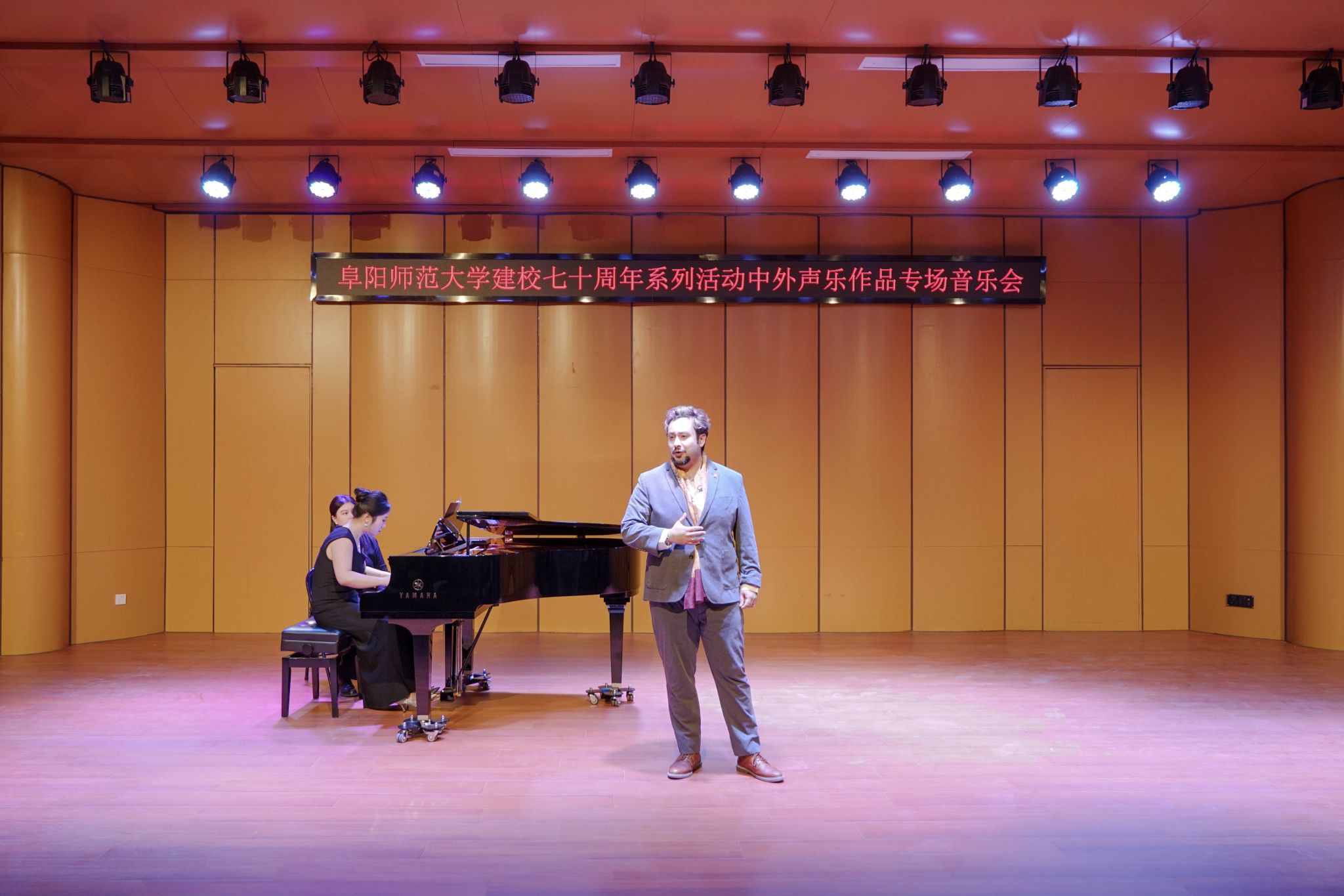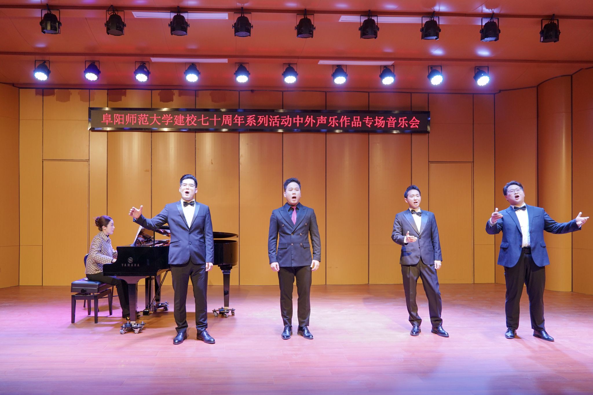七秩弦歌血脉不辍,岁岁相承师道薪火。3月13日晚,由音乐舞蹈学院、国际合作与交流中心、校团委、阜阳市音乐家协会、阜阳市文化馆共同主办的“弦歌七秩·薪火师大——阜阳师范大学建校七十周年系列活动之中外声乐作品专场音乐会”在清河校区音乐舞蹈学院音乐厅精彩上演,以此开启建校七十周年系列活动的序幕。校党委常委、副校长王诗兵出席音乐会,安全管理处(党委保卫部)、校团委、审计处、音乐舞蹈学院以及阜阳市音乐家协会等单位负责人受邀共赏音乐会。