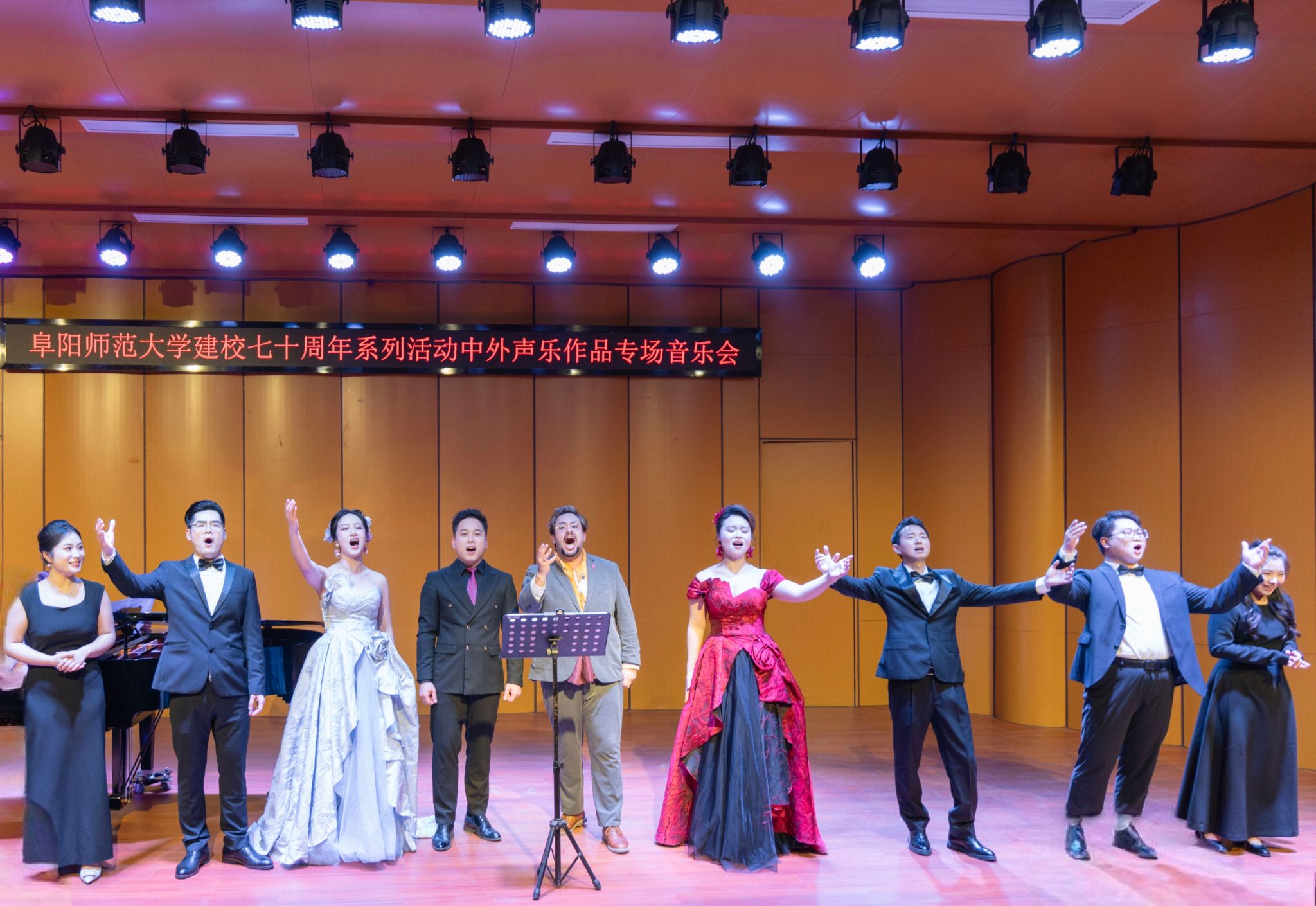 音乐会尾声,音乐舞蹈学院青年声乐教师和何塞博士集体登台,深情唱响《不忘初心》与《我爱你中国》。老师们以饱满的热情和赤诚的歌声,抒发了对教育事业初心不改的坚定信念,表达了对祖国的无限热爱。熟悉的旋律、磅礴的和声,深深感染了在场观众,为这场音乐盛会画上了圆满句号。