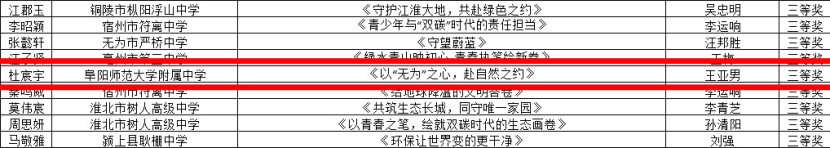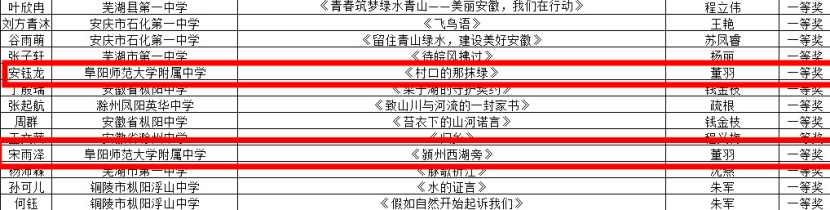 为深入学习宣传贯彻习近平生态文明思想,引导青少年树立“尊重自然、顺应自然、保护自然”的绿色发展理念,团省委组织开展了“美丽安徽•青春行动”青少年环保科普暨主题征文展示活动。近日,活动结果揭晓,我校附属中学学生凭借扎实的文学素养和深厚的环保情怀,在此次活动中脱颖而出,载誉而归。