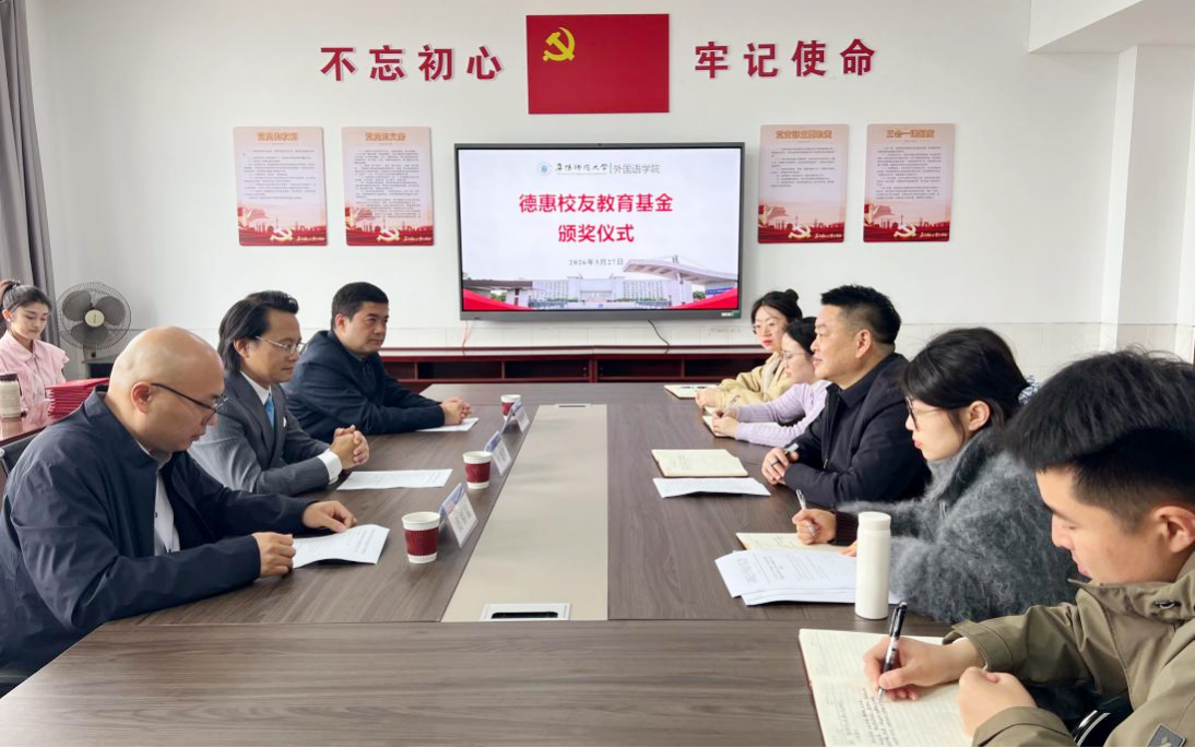 为凝聚校友力量、深化资助育人实效,助力学生成长成才,3月27日,我校举行“德惠校友教育基金”颁奖仪式暨校友职业规划讲座。校党委常委、副校长窦贤琨,我校校友、德惠校友教育基金设立人、湖南优钻工程科技有限公司总经理申德义以及德惠校友教育基金委托人、教务处负责人出席活动。外国语学院负责人、辅导员及获奖学生代表参加活动。