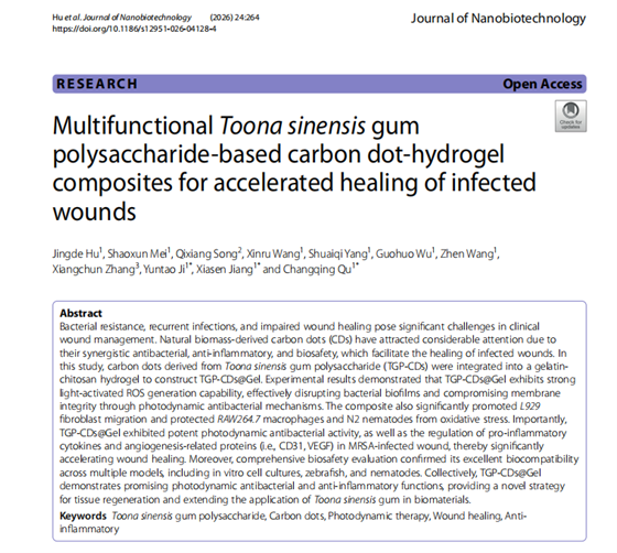 屈长青教授课题组长期致力于香椿的全产业链技术开发与研究,已成功开发了香椿茶、香椿酱和美美睡等产品,并将太和香椿在安徽池州、新疆伊犁和贵州六盘水等地进行了矮化密植种植与技术推广。本研究展示了一种将天然香椿胶多糖转化为光动力生物质碳点,并与功能性水凝胶协同集成的创新策略,不仅推动了香椿活性成分的现代化开发与高值化利用,也为多功能纳米药物的设计提供了新思路。
