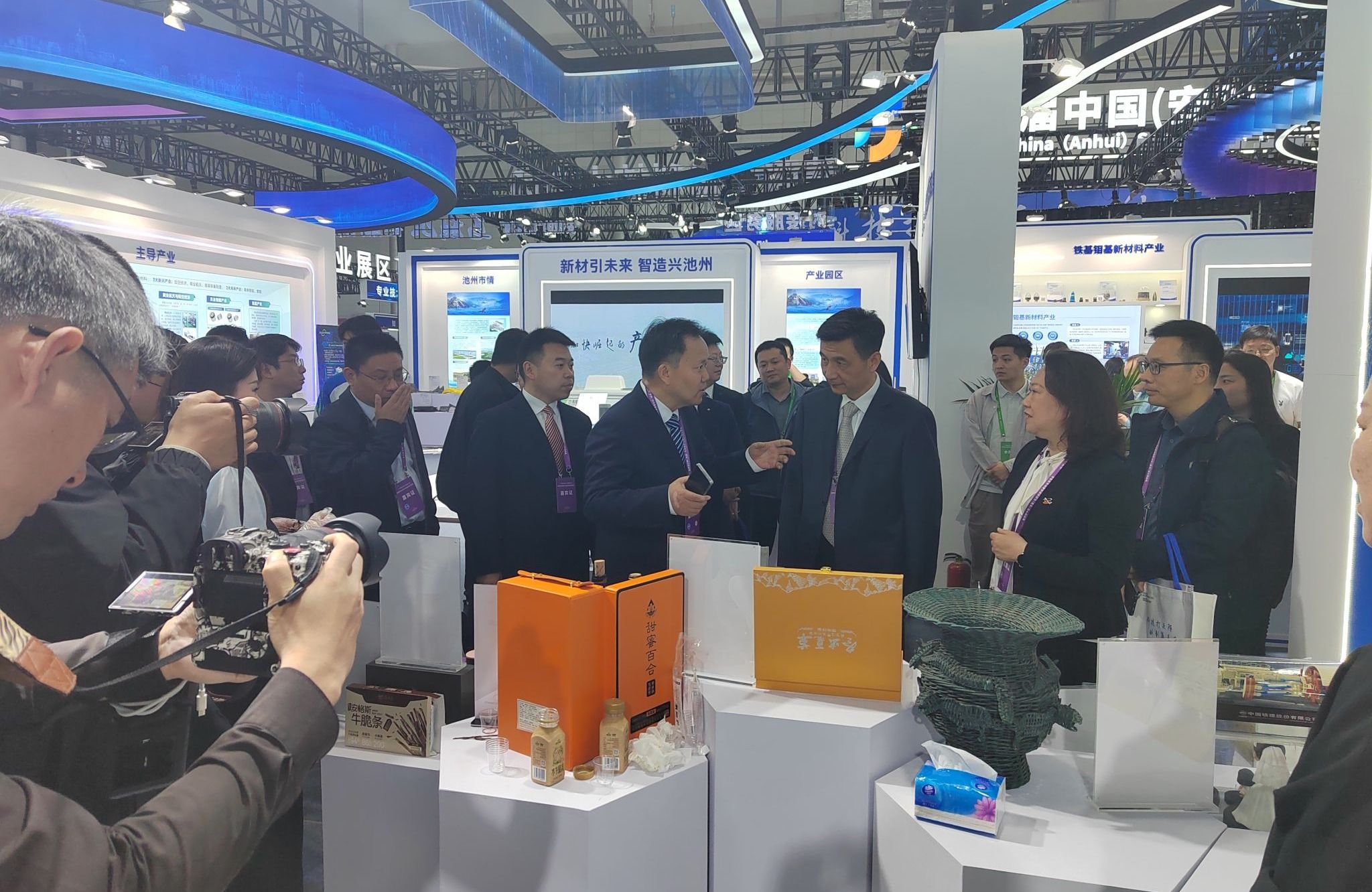 展会现场,阜阳市委副书记、市长胡明文,副市长杨善竑带队来到我校展台参观调研,认真听取参展项目研发背景、核心技术、应用前景及成果转化规划汇报,详细了解职务科技成果赋权试点成效。胡明文充分肯定我校立足阜阳产业特色开展定向科研攻关、深耕实用科创研发、深化校地融合的务实举措,同时鼓励学校紧扣地方发展需求,加快科研成果转化落地,推动更多优质科创项目扎根阜阳,助力本地特色产业提质升级。