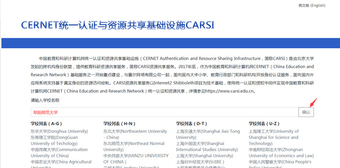 1.从学校主页下方点击统一门户并登录进入,再点击CARSI资源平台,然后在输入学校名称栏中输入阜阳师范大学(一定不要输入其他学校,如输入出错需要清除浏览器缓存重新登录),点击确认进入资源列表(如下图所示)。