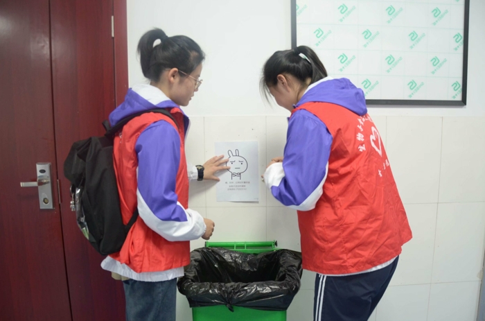 活动中,志愿者们带着精心制作好的表情包标识,前往躬行楼D、E楼活动指定地点,分工明确,配合默契,较好组织完成了防控表情标识的张贴与宣传。
