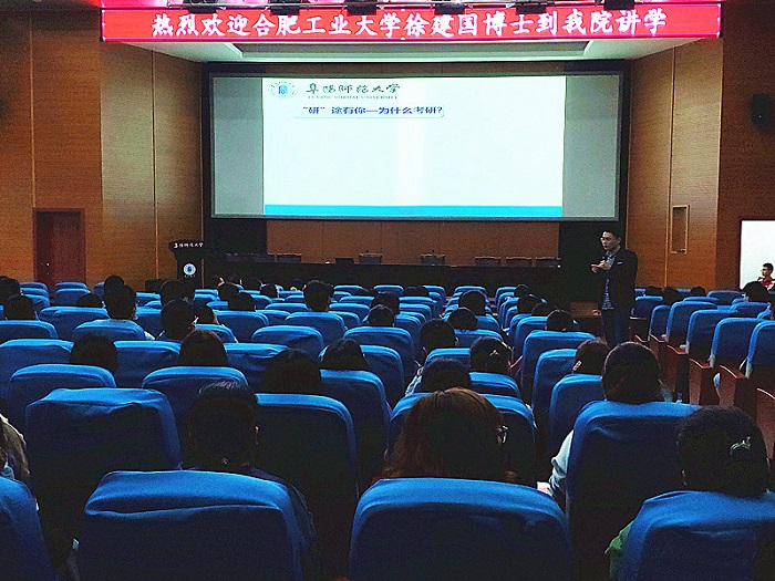 10月15日下午,化学与材料工程学院2012届校友、合肥工业大学教师徐建国博士应邀回母校,做客“化青春论坛”,与广大考研同学分享了考研及研究生期间的成长经历。化学与材料工程学院院长盛良全、副院长陈水生出席了报告会。