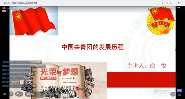 2020年6月20日下午,计算机与信息工程学院在钉钉群举办“飞young中国梦,与信仰对话”——2020年“青马工程”培训班的首节团课,该院团委书记、校青年讲师团成员徐悦讲授《中国共青团的发展历程》。参加学习的有2019级学生会主席团和部长团成员、院团委委员会成员、2019级各班级团干部以及2020年度拟发展入团的学生。