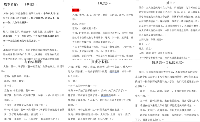 本次赛事围绕校园生活为主题,同学们充分发挥创意,创作出了内容与情节俱佳的优质情景剧本,涉及人际关系、校园贷、不良情绪等社会热点话题,就大学生常见的心理问题等进行了深刻探讨,这些剧本有的感人至深,有的诙谐风趣,也展现了多姿多彩的大学校园生活。齐福赛同学的《攀比》讲述了同学小北家庭条件差,却在攀比心的驱使下,沾上校园贷,最后在老师与同学们的帮助下,逃脱出校园贷的牢笼;巫晴怡同学的《重生》讲述了主人公苏婉为树立完美女神的形象,谎称会小提琴,在将要上元旦晚会表演之际,不惜伤害自己,躲掉表演,最后在竞争对手的开导下,向大家承认错误并被同学们坦然接受的故事;乔秀琴的《与自信相遇》讲述了自卑且内心敏感的韩一同学,在开学社团面试时,因室友的鼓励,勇敢的展现了自我,学会了自信。经过组织评审,最终2019级园林2班齐福赛同学所创作的《攀比》获得本次赛事一等奖。