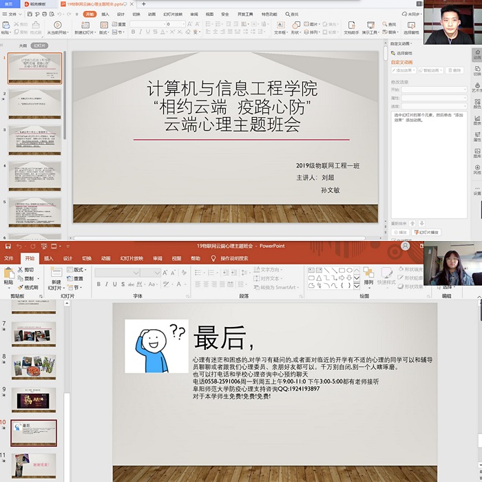 为引导大学生在疫情期间建立理性平和、积极向上的健康心态,该院心理委员联合会决定开展云端心理主题班会,5月底至6月中旬,2017级-2019级800余位学生在各班级心理委员的带领下共同参与此次活动。