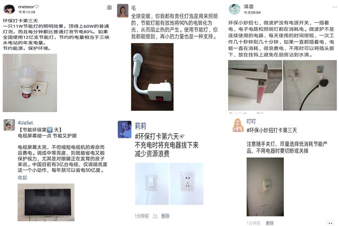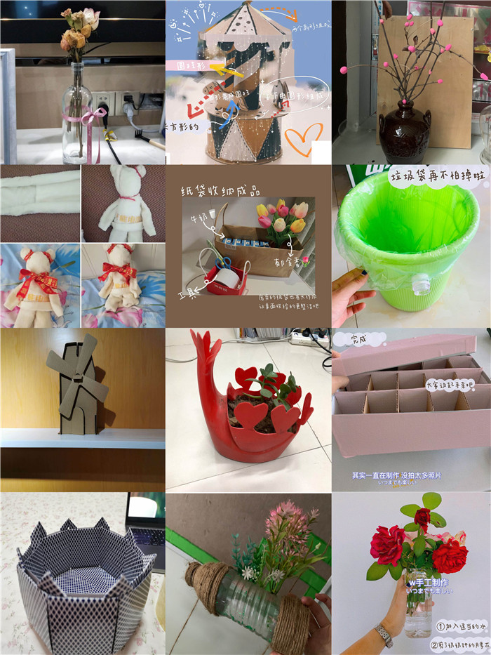 通知发出后,许多同学积极响应。截止至6月17日,共有百余人次投送作品750多张。同学们纷纷在微信朋友圈、QQ动态里展示各自的节能环保小技巧和废物改造成果,从衣食住行的方方面面挖掘创意,实用性与观赏性兼备。大家通过晒出自己的环保行动、环保创意影响身边更多的人参与到环保事业中来。通过线上评审,来自18级视觉传达设计3班的蒋美玲因极具特色的创意加上实拍创作小视频的细致夺得了本次大赛的第一名,19级视觉传达设计1班的张亚婉和美术学1班的周诗颖分别获得第二和第三名。