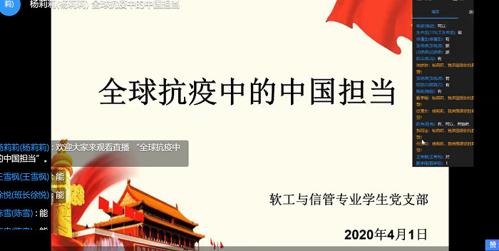 为进一步加强学习,增强青年党员的使命担当意识,坚定“四个自信”,计算机与信息工程学院软工与信管专业学生党支部于4月1日下午开展线上主题党日活动。此次活动以“全球抗疫中的中国担当”为主题,学生党支部书记杨莉莉主持学习活动,支部全体党员参加学习。