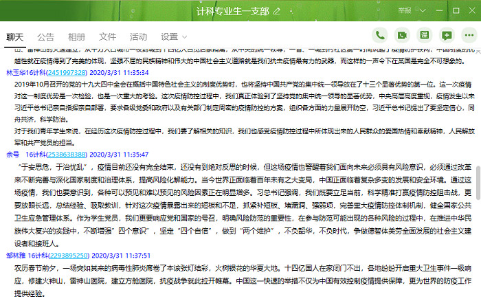 学习结束后,支部党员纷纷在QQ群内分享学习心得,展开讨论。中国抗击新型冠状病毒肺炎疫情防控措施取得积极成效的原因,在于中国共产党的正确领导和中国特色社会主义制度的显著优势。疫情发生以来,从中央到地方,中国展现出很强的动员能力和组织能力,中央高层高度重视,各级党委和政府积极行动,基层党组织雷厉风行,普通党员和群众积极投身一线,在疫情紧急情况下把资源第一时间分配到最需要的地方。疫情防控中党中央始终把人民群众生命安全和身体健康放在第一位,中国共产党以人为本理念、以人民为中心立场在此次疫情防控中体现得更为突出。全民动员,上下一心,齐心协力,共克时艰,彰显了中国共产党团结带领广大人民群众抗击疫情的显著优势。疫情之下的中国速度、中国效率、中国精神、中国力量、中国奇迹,充分展示了中国共产党领导的最大优势和中国特色社会主义制度的显著优势,让全世界人民为之惊叹。
