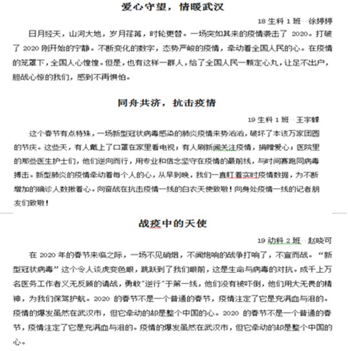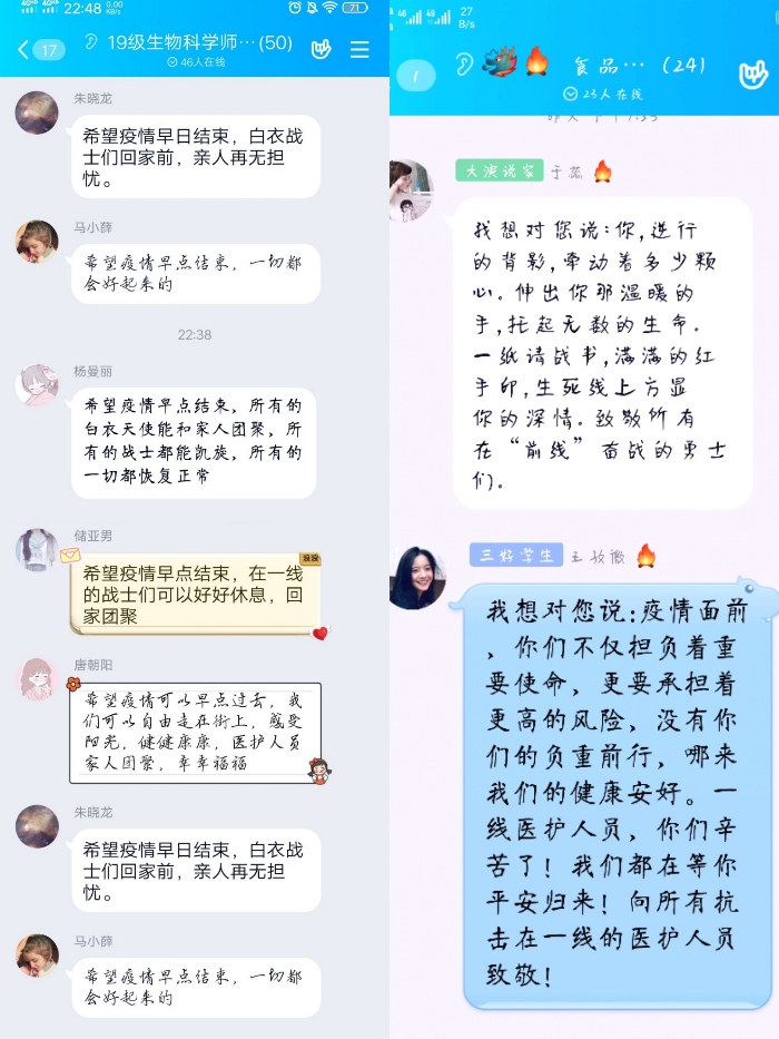 本次活动,各班级心理委员组织大家以祝福接龙的形式,开展“我想对您说……”活动,为坚守在一线的战士们献上自己最真挚的祝福。除此之外,还有一些同学以文章的形式,展现了疫情期间自己的内心世界。他们感叹着疫情期间的生活变化,赞美着奔赴在一线的医护人员,敬佩着在实验室里潜心研究的科研人员,牵挂着患病者的安危……在字里行间中也流露出同学们的渴望和期待,因为大家坚信,只要齐心协力,众志成城,就一定能共渡难关。
