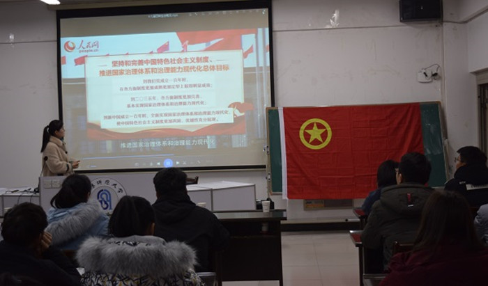 随后徐悦为大家进行党的十九届四中全会精神宣讲。她通过生动、全面的讲解,让在座的团干部深刻领悟“坚持和完善中国特色社会主义制度、推进国家治理体系和治理能力现代化”的重大意义。
