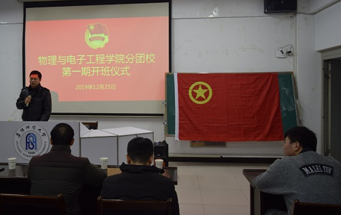 进一步加强基层团组织建设,强化基层团干部的理论学习和实践工作能力,建设一支政治可靠、本领过硬、作风扎实、要求严格的团干部队伍,近日,物理与电子工程学院于躬行楼C楼505举办该院团校第一期开班仪式。我校团委副书记刘晓娟,计算机与信息工程学院团委书记徐悦,该院党委书记马健、党委副书记田志坚,教工党支部书记李震,该院挂职团委副书记李聪出席此次开班仪式,会议由李聪主持。