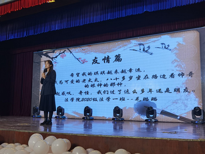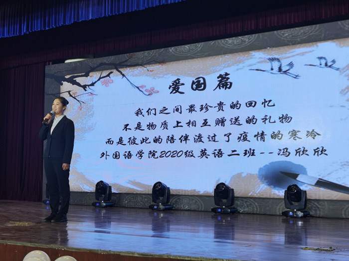 活动由大学生艺术中心带来的开场舞《幻想童话》正式拉开帷幕。参赛选手依次上台展示,给大家讲述作品的创作灵感、用意,分享作品背后的感人故事。爱国篇《繁星点点,如炬闪耀》《微笑战疫,你我同行》《山河依旧,春风如约》和《家人闲坐,灯火可亲》等作品向无数奋战一线的逆行者致敬,诉说着自己强烈的爱国激情。亲情篇《那天》《妈妈,我爱你》《想见你》等作品让大家明白这世间最圣洁、最美好的感情是血脉相连的亲情。友情篇《所念皆星河》《温柔岁月的她》《慢慢相遇》《灯火阑珊处,你是光亮》等故事则是引导观众们追溯自己的青葱年华;爱情篇《匆匆那年》《相见一离别》《下落不明》《一吻定情》等作品向大家分享着自己的爱情故事。其中,“我看不见你口罩下的表情,但我看得见你眼眸中的笑意”更是让人为之感动。在文艺汇演过程中,该院心理委员联合会成员带来的小品《细胞大作战》、心理情景剧《守护者》,大学生艺术中心带来的《相信》,王婧、代蕊带来的合唱《也许明天》以及现场的抽奖环节一度将现场氛围推向高潮。