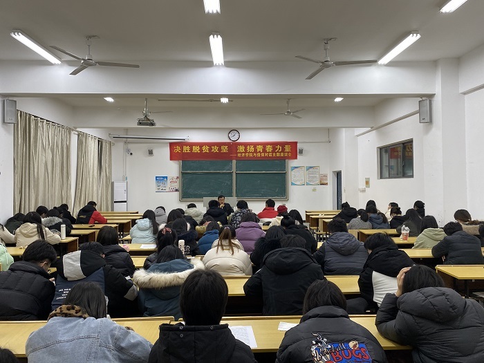 2020年,是全面建成小康社会的收官之年,也是脱贫攻坚战的决战之年,为使广大青年团员在脱贫攻坚决战中经历风雨、挥洒汗水,以奋斗之我、青春之我,承担起历史赋予青年一代的责任,经济学院于12月16日在汉风A楼207教室组织开展以“决胜脱贫攻坚 激扬青春力量”为主题的座谈会,学院党委副书记孟继超与经院学子畅聊在扶贫一线的所思所想所感,呼吁同学们朝着感恩党、爱祖国、奔小康方向奋斗,积极投入到脱贫攻坚活动中来,献出自己的爱心,以充实饱满的信仰,让梦想升华,实现伟大的中国梦。