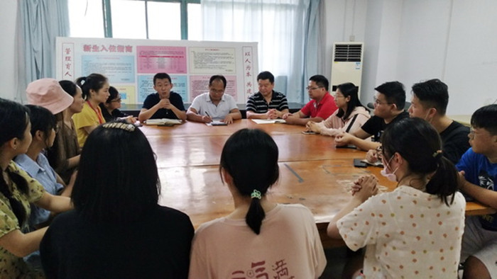 走访结束后,外国语学院在学生公寓会议室召开了学生社团主要负责人、各班级学生干部代表座谈会。同学们畅谈和反映了春季线上学习、假期居家生活、返校所见所闻和学生返校后关心的各类问题。学院领导和辅导员肯定了学生居家学习的积极努力,就学生反映的问题进行了细致解答。戴亮在会上就开学后精准掌握学生健康状况、突发事件处理、上好开学第一课、学生公寓门禁卡打卡、宿舍文明创建等工作向参会学生做了说明和要求。梁长武结合学院工作实际,对疫情期间学生干部工作提出了要求。坚持安全第一,在自我防护的基础上,配合好学院工作,将学校和学院的决策部署传达给班级同学;要遵从规矩,严格要求全体学生自觉遵守校规校纪;要做好表率,要发挥学生干部的引领作用,全面做好开学后学生管理服务工作。