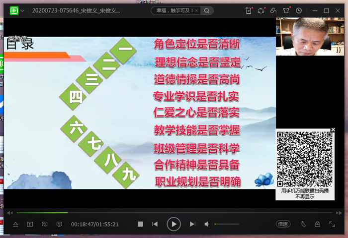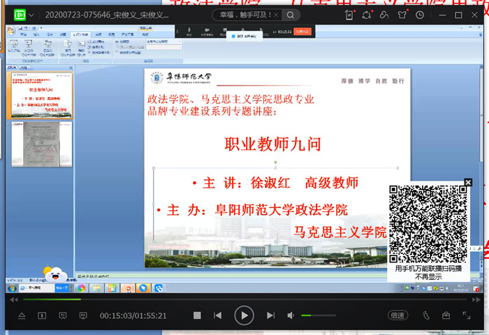 为了加强思想政治教育专业建设,提高思想政治教育专业学生对教师职业的认识认同,2020年7月23日上午,马克思主义学院与政法学院联合邀请阜阳师范大学附属中学政治教研组组长、高级教师徐淑红,利用钉钉平台进行“教师九问”专题讲座。讲座由思想政治教育教研室主任宋俊义主持、马克思主义学院院长闫成俭、思想政治教育专业负责人杨新宇及2017级、2018级、2019级全体思政专业学生参加了活动。