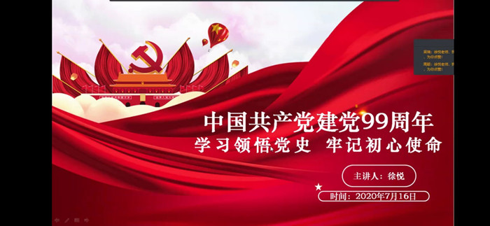 支部书记徐悦向大家阐述什么是“四史”,为什么要学“四史”。徐悦通过视频、图片和文字和大家一起回顾了中国共产党成长、发展、壮大过程中的重要历史节点和重大事件,全体成员也积极地在群中交流讨论。主题党课将中国共产党99年的奋斗历史与新时代“不忘初心、牢记使命”主题教育紧密结合,教育引导全体成员唯有坚定信念,继续前进,才能担当好民族伟大复兴的历史重任。