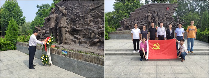 全体党员在刘邓大军纪念雕像前静默肃立,为革命烈士敬献花篮,马健为花篮整理绶带,并带领全体党员在庄严的氛围中面向党旗重温入党誓词。