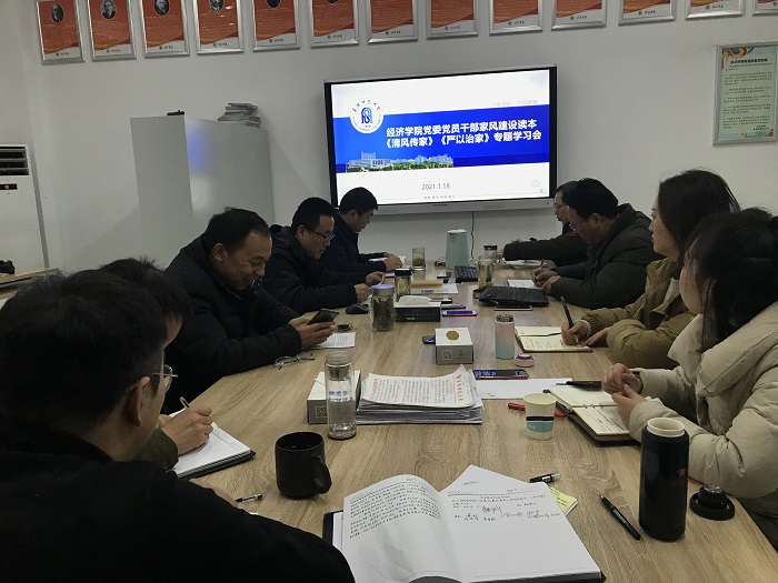 1月18日,经济学院在汉风B楼213会议室召开党委理论中心组学习扩大会议,专题学习研讨党员干部家风建设读本《清风传家》《严以治家》。党委理论学习中心组成员、党支部书记、专兼职辅导员参加会议,会议由学院党委书记黄琼主持。