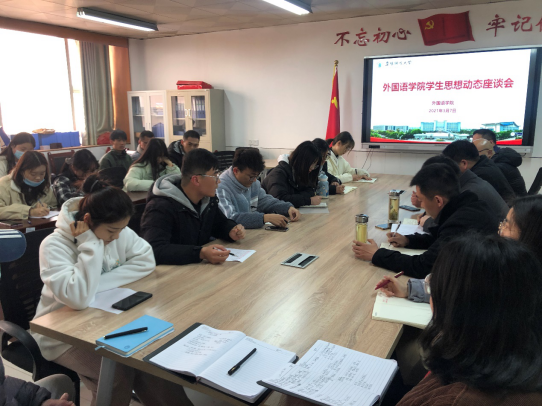 为及时全面了解新学期学生思想动态,提升思想引领的针对性和实效性,推进“三全育人”工作落实落细,3月7日下午,外国语学院在景行楼816召开新学期学生思想动态座谈会。该院党委书记刘张飞、院长赵从义、党委副书记戴亮、副院长高福猛、各班级辅导员及学生代表参加会议,会议由戴亮主持。