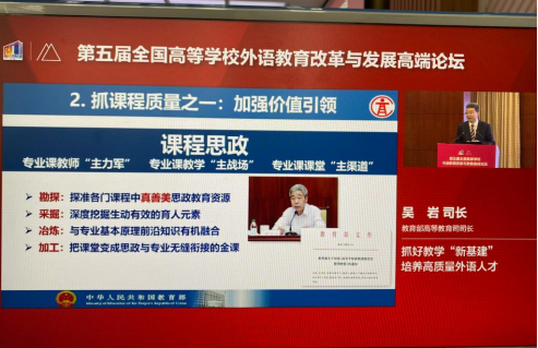 吴岩司长在报告中指出,发展外语教育是全球共识以及外语教育的重要任务,抓好人才培养的新基建要从四个方面抓起,夯实教学“新基建”托起人才培养高质量。他强调抓专业质量,优化专业结构、抓好质量标准、具备国际视野、强化引领示范。抓课程质量,加强价值引领、持续打造金课、强化示范带动。抓教材质量,建设优秀教材、优化教材内容。抓技术水平,从“术”到“道”、深入推进教学实践、打造国际课程平台、建强基层教学组织、聚焦网络原住民。