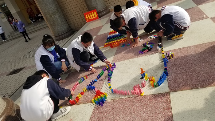 本次科技创新运动会共设置5个项目,比赛阶段,566名参赛学生现场限时制作并参加比赛。参加多米诺骨牌的学生根据自己的设计图案耐心和细致摆放,需要班级团队的合作;参加铁丝陀螺、水火箭、鸡蛋撞地球的学生需要科学的设计,运用不同的工具制作并不断调试自己的创意作品以达到最佳方案。