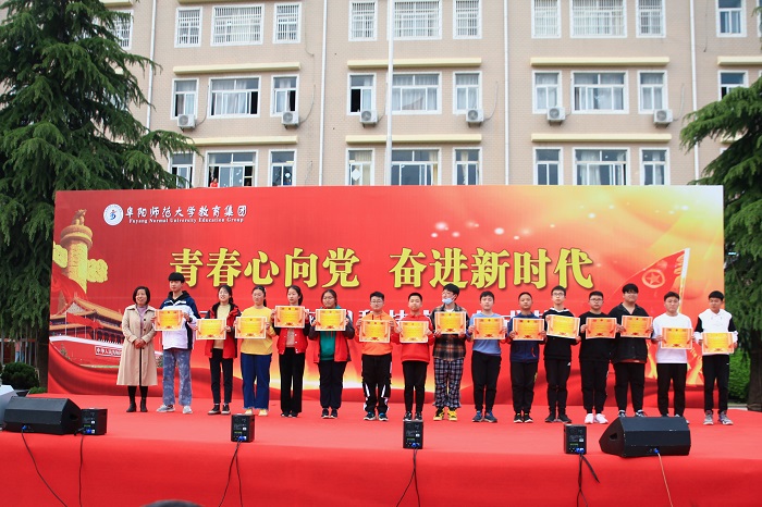 在演出过程中,教育集团党政主要领导分别为本届校园科技文化艺术节各项比赛中获奖班级颁奖并合影。