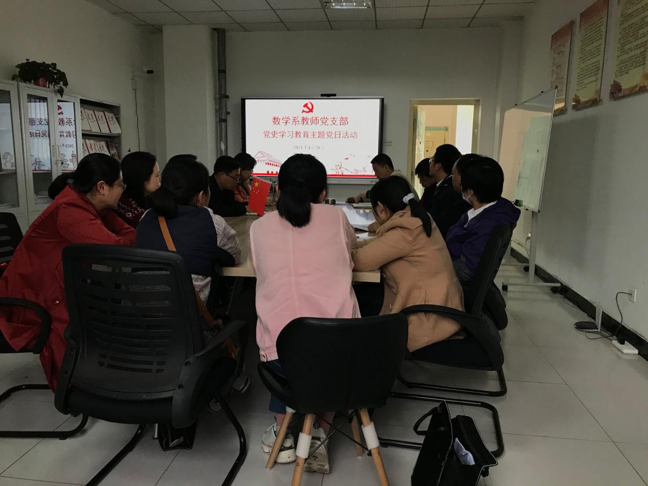 4月28日下午,数学与统计学院数学系教师党支部开展“学党史、强党性”党史学习教育主题党日活动,活动由支部书记唐剑主持。学院院长盛兴平、支部全体党员参加活动。