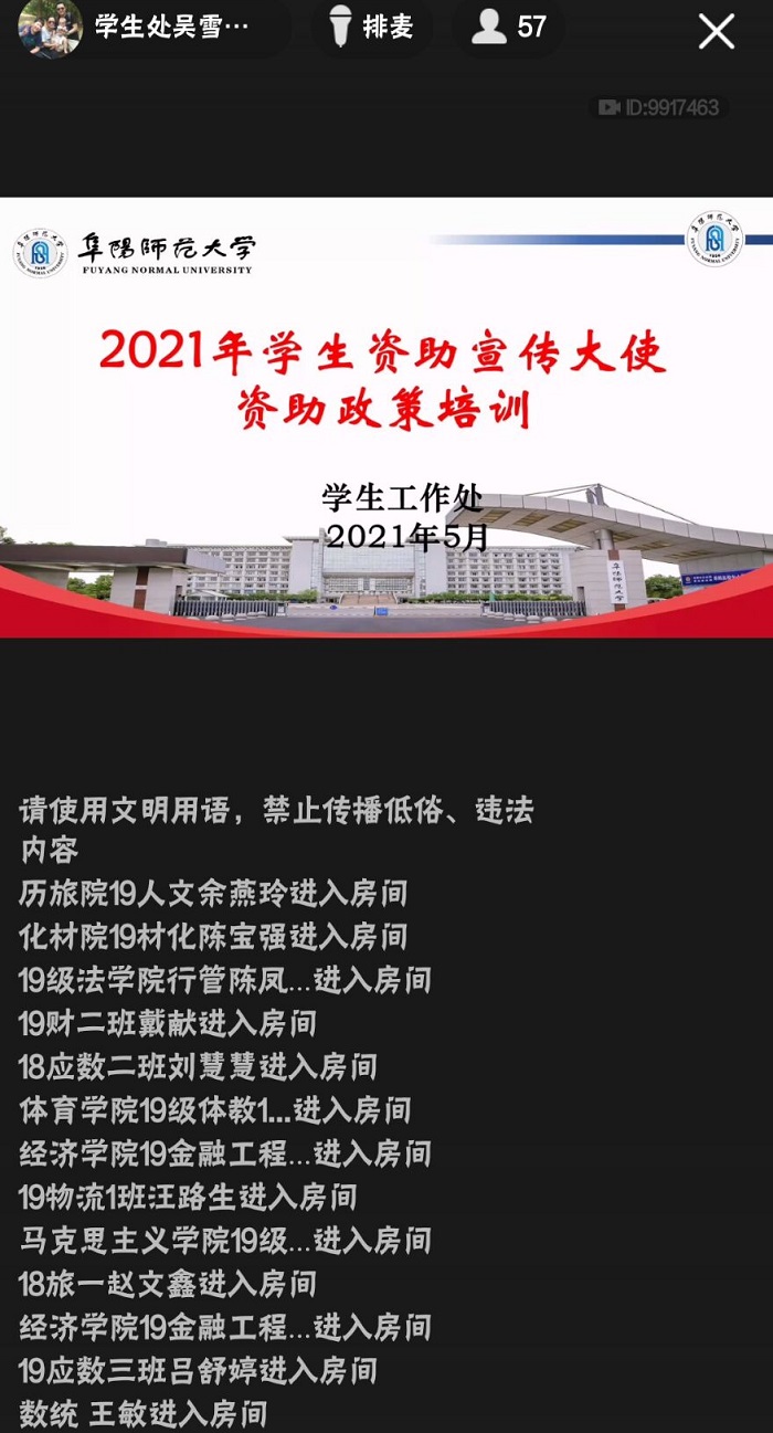 为加大学生资助政策和资助工作宣传力度,增强学生的感恩意识与社会责任意识,提升我校资助育人工作实效,5月28日晚,我校2021年“学生资助宣传大使”专题培训会通过腾讯群课堂直播方式顺利举行。培训会由学生工作处吴雪影主讲,57名学生资助宣传大使及13名指导老师参加了培训会。