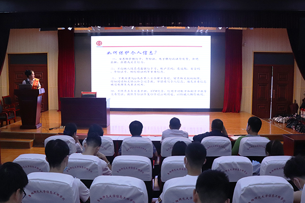 师院支行理财经理刘娜娜利用丰富的工作经验,通过朴实的语言向同学们生动讲述了“冒充QQ好友”“冒充身份诈骗”“网络购物”“虚假中奖”等多种常见诈骗套路;随着互联网金融的发展,“网银”“钓鱼网站”“网络理财的骗局”等新型网络金融诈骗呈现逐年增多趋势,重点讲述了“网络贷”存在的问题与套路。同时,针对近来多发的网贷诈骗案件,盛颖老师提醒同学们树立正确的消费观,自觉抵制“网络不良贷款”,提高警惕,遇事三思,保管好个人信息,坚守“不透露”“不轻信”的原则,按约还款,珍爱信用。