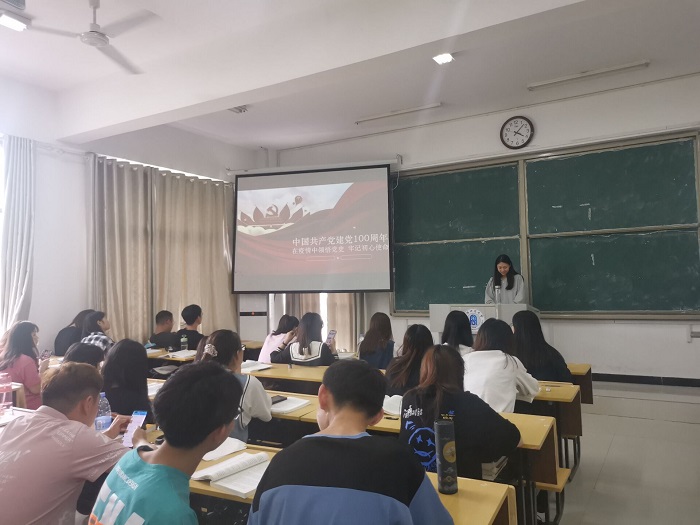 宣讲伊始,伍容蝶围绕“在疫情中领悟党史,牢记初心使命”的主题,用自己的独特视角,循着时间脉络,用青年学子喜闻乐见的方式讲述建党百年光辉历程,以青春话语献礼建党百年。在她的讲述下,全体参会人员深刻了解了党史的发展脉络及重大意义,党的历史给我们的三大启示和中国共产党的三大历史贡献。伍容蝶在宣讲中融入自身感情与感悟,将严肃的内容与生动的表达相结合,使党史教育的氛围更加浓厚、内容更加深入人心。宣讲期间,她分享了自己对于身处国家和社会危难之时,当代青年如何来肩负自身的时代使命和历史重担的思考和感悟。班级同学听完宣讲后纷纷表示,要把个人的成长进步融入到推动国家发展,民族振兴的时代洪流中去,与时代同步伐,与祖国共命运,成为一名有担当、有责任、有志气的新时代好青年。