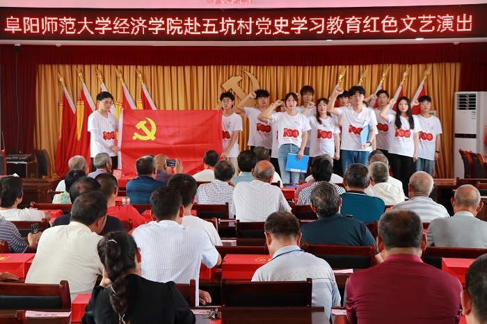 党史宣讲,文艺下乡。经济学院党委副书记孟继超以“弘扬伟大建党精神,凝聚五坑振兴力量”为题进行党史宣讲,随后由志愿小分队全体学生成员表演话剧《1919》、朗诵《走在您的旗下》及红歌合唱。