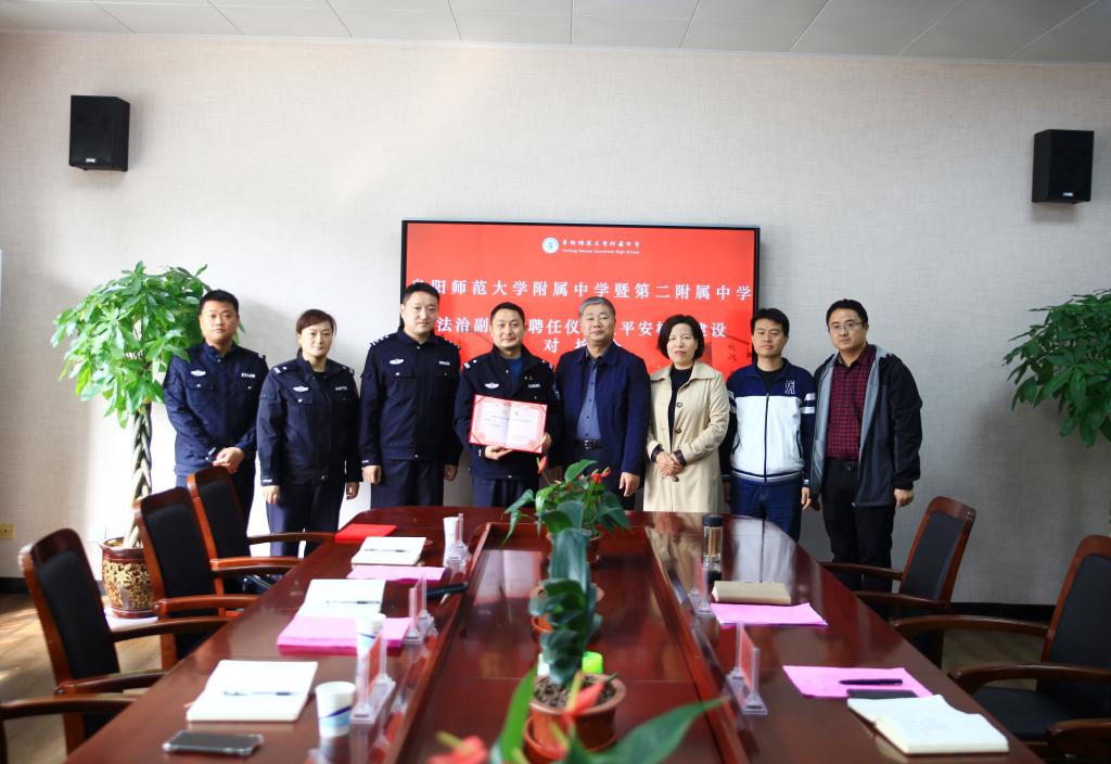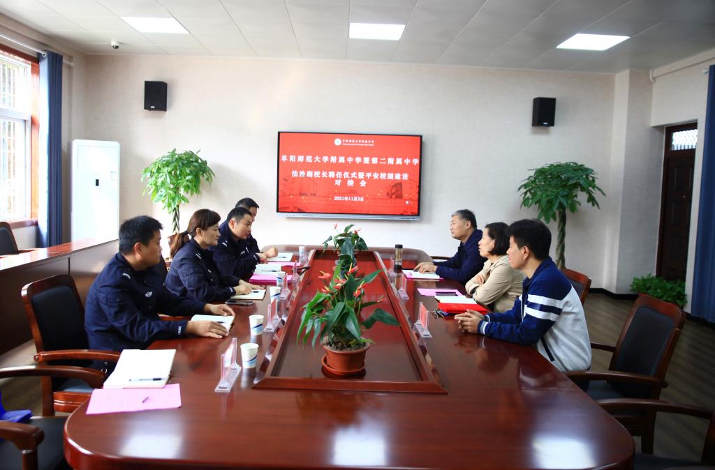 为加强学校法治教育,增强全校师生的法治意识,11月2日上午,附中和第二附中在求真楼101会议室举行法治副校长聘任仪式暨平安校园建设对接会。颍州区公安分局三岔路派出所所长李淼、副所长沈小军,民警侯苏颍、徐风光、谢婷婷,教育集团党总支书记王健、副书记徐升参加会议。会议由教育集团总经理、附中校长高家芳主持。