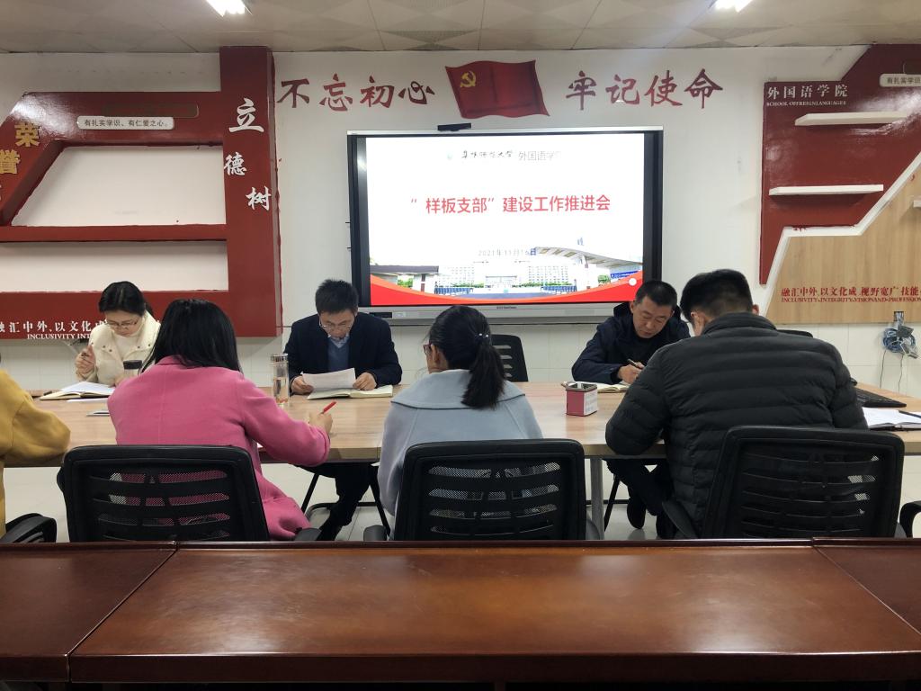 为扎实做好第二批校级“样板党支部”创建工作,推动新时代学院党建示范创建和质量创优,11月16日下午,外国语学院组织获批立项的3个基层党支部召开“样板支部”创建工作推进会。会议由学院党委书记刘张飞主持,院党委副书记戴亮、各支部书记、支部委员参加会议。