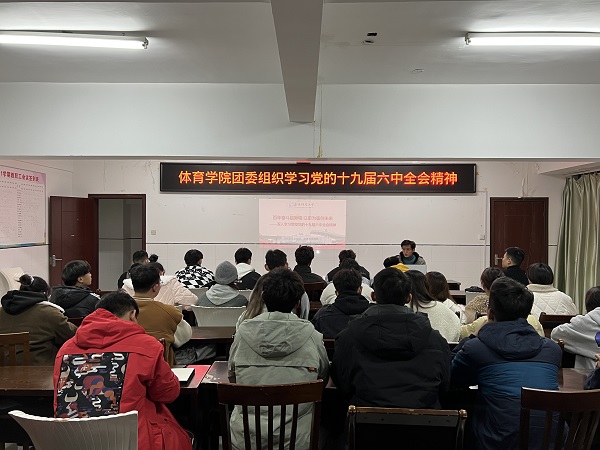 11月24日体育学院分团委组织团员青年在体育馆四楼会议室专题学习党的第十九届六中全会精神。学院特邀校青年讲师团成员刘凯担任主讲嘉宾,体育学院团委负责人刘安国主持宣讲会,体育学院各班团学干部参加会议。
