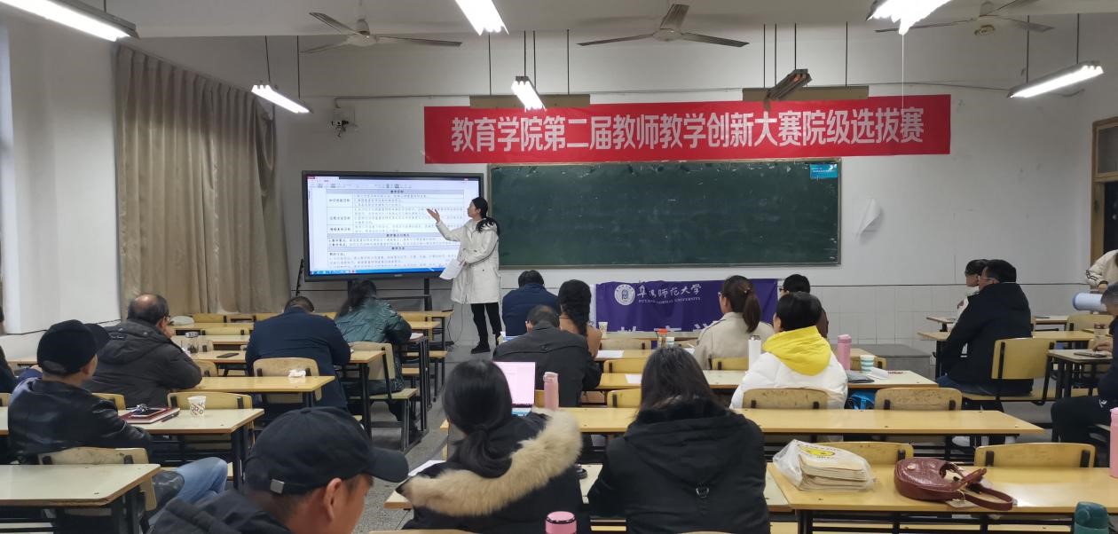 为深入落实立德树人根本任务,助力课程思政建设和新文科建设,推动信息技术与教育教学融合创新发展,打造教学改革的风向标,教育学院于12月8日下午在景行楼511教室成功举办第二届教师教学创新大赛院级选拔赛。教务处处长张宏到场指导,校学工部段姗姗、文学院魏锦虹与生物与食品工程学院耿秀婷等3位老师担任评委。全体教职工到现场观摩学习,选拔赛由教育学院副院长王胜主持。